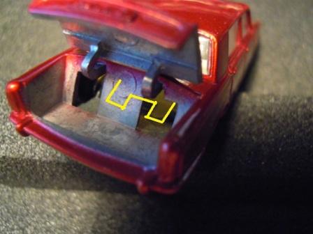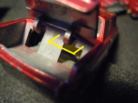 There are however Two thickness for the suspension strip, because all early issues of the model have weak suspension as evidenced by the car sitting very low on it's wheels. A thicker plastic strip was introduced on models just after the introduction of the larger base rivet, to help with this design fault, so later models feel firmer on their suspension when you gently press down the model with a finger.