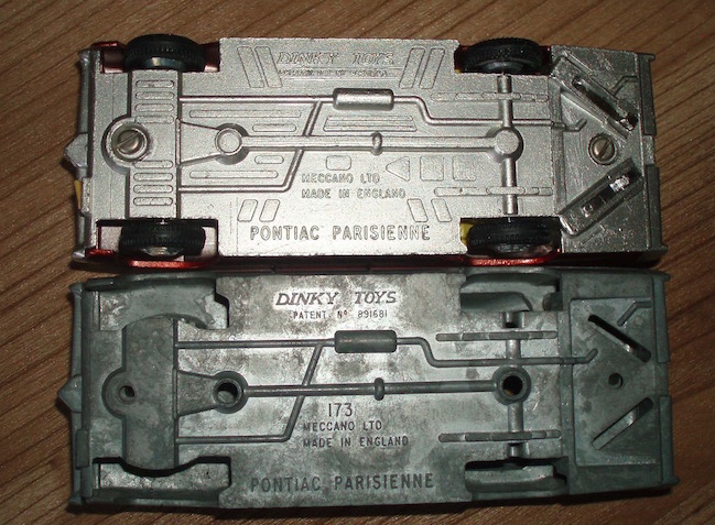 The letter A cast on the production chassis may mean that there were two moulds or a double cavity mould. Are there any chassis with a letter B ? The reference number 173 has been blanked from the base of my Pontiac, where the early chassis marked 173 ? If so a large photo would be welcomed.