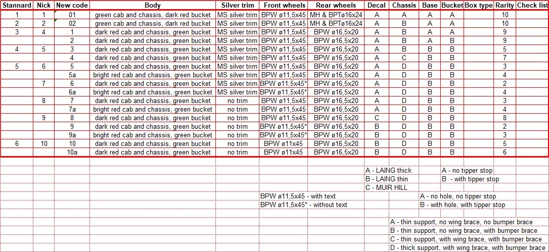 I am enclosing a proposal of a new 2c list. I have added some new variations: tipper stop on chassis, tipper stop on bucket, wheels mit metal hubs (MH & BPT ø16x24), wheels with/without any traces of the text, thin/thick text on the decal and dark/bright red body painting.