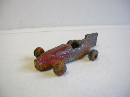 There are two cars in the Vectis set, a racing car and what looks like a Land Speed record car but was probably still referred to as a racing car! The Joplin photo has two record cars in red. I have managed to get an example of each, both are in very poor condition. My record car is the only one I've seen with hubs rather than one piece wheels and goodness knows where I'll find tyres as they really are tiny hubs, much smaller than those fitted to my John Hill Mack trucks. They are both slush cast and the axle's are very corroded. They look as if they may be cast into the bodies, hopefully I'll know for sure when I clean them up. These cars are roughly the same size as a Lesney Maserati 4CLT and I'm not 100% sure on the catalogue number. My listing shows A32 as a Racing Car which could cover both of them, and there is also a catalogue number A223 which is Motor Cars (various)......