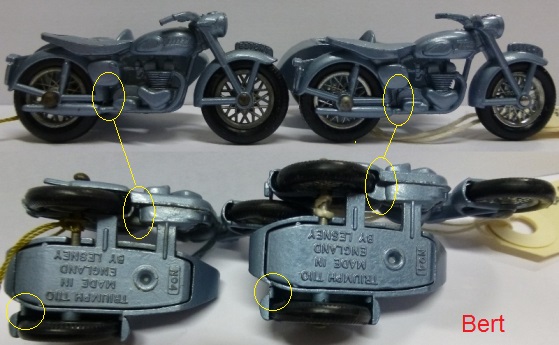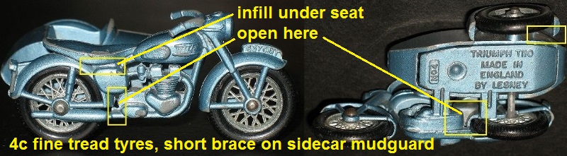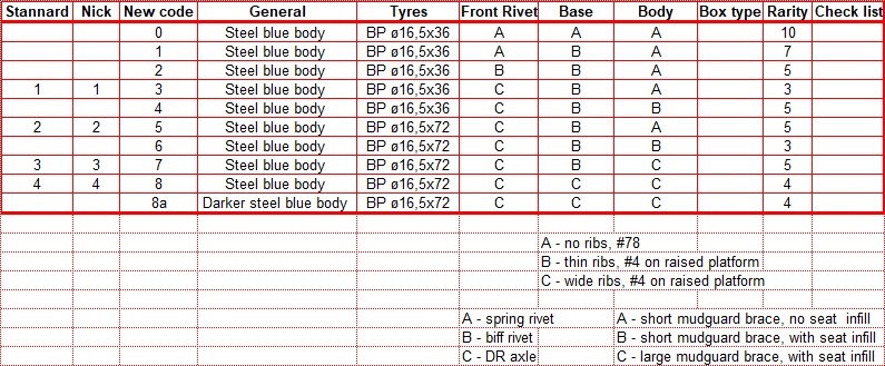 Having just digested the information provided in this thread and applied it to the examples in my own collection, I have found one combination which seems to be missing in the listings above: a model with the earlier, shorter left mudguard brace and with the infill in front of the right mudguard present (72 tread tyres, narrow base ribs and infill under seat as expected).