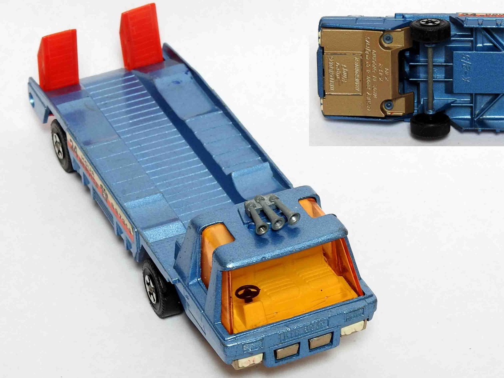There is a cast variation found on the rear of the truck - lines that continue until the end while others it ends with a smooth deck. Headlights can be found in chrome or white. Another car found loaded on this truck is the K54 AMX Javelin which is not included. I am sure that shades of yellow (on the base) exist plus shades of amber in the windows.
