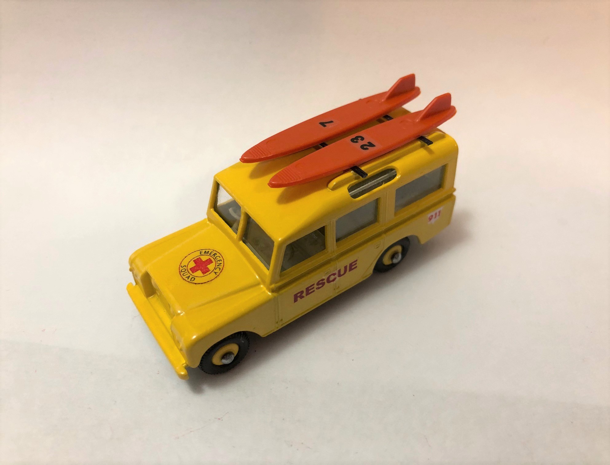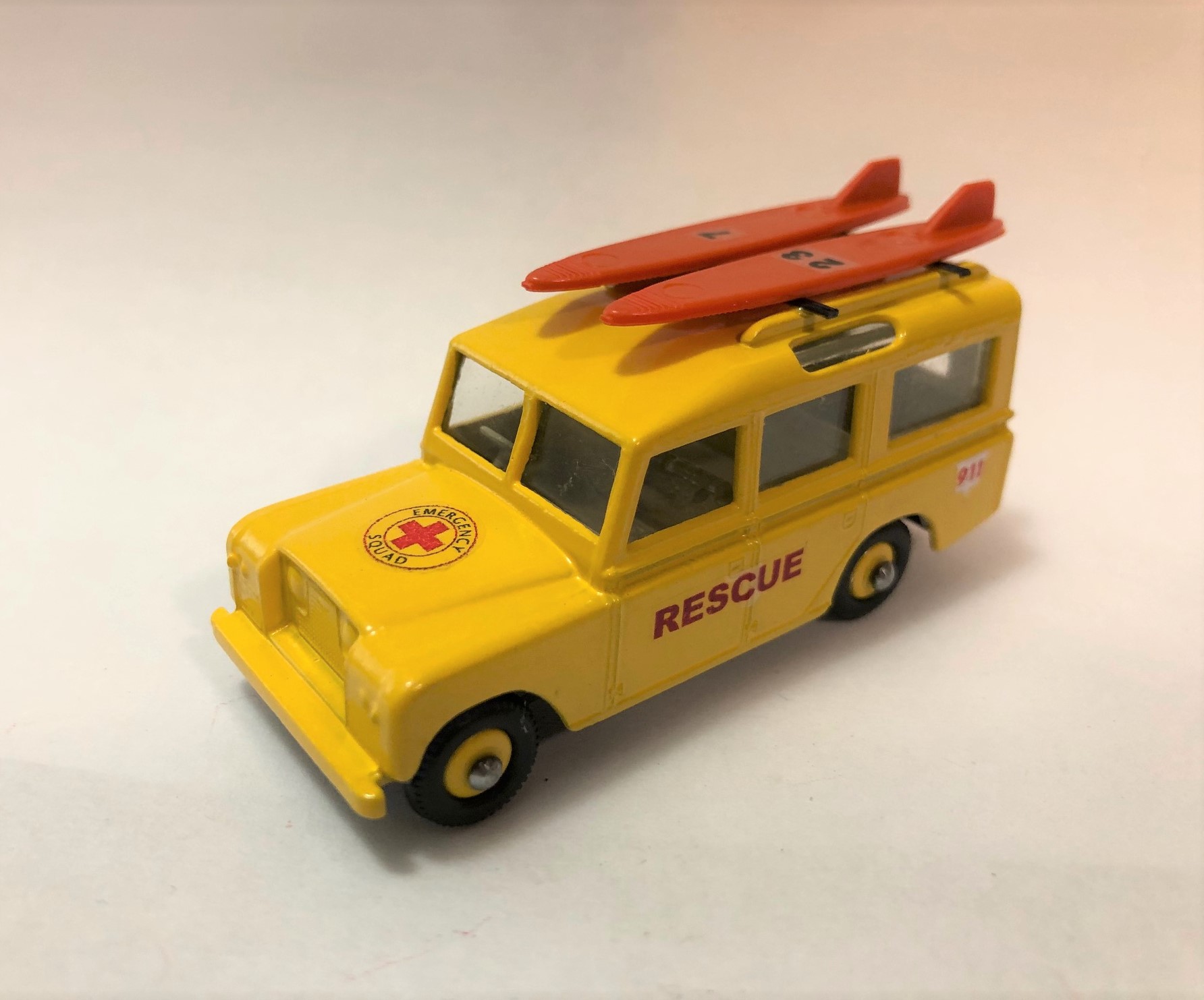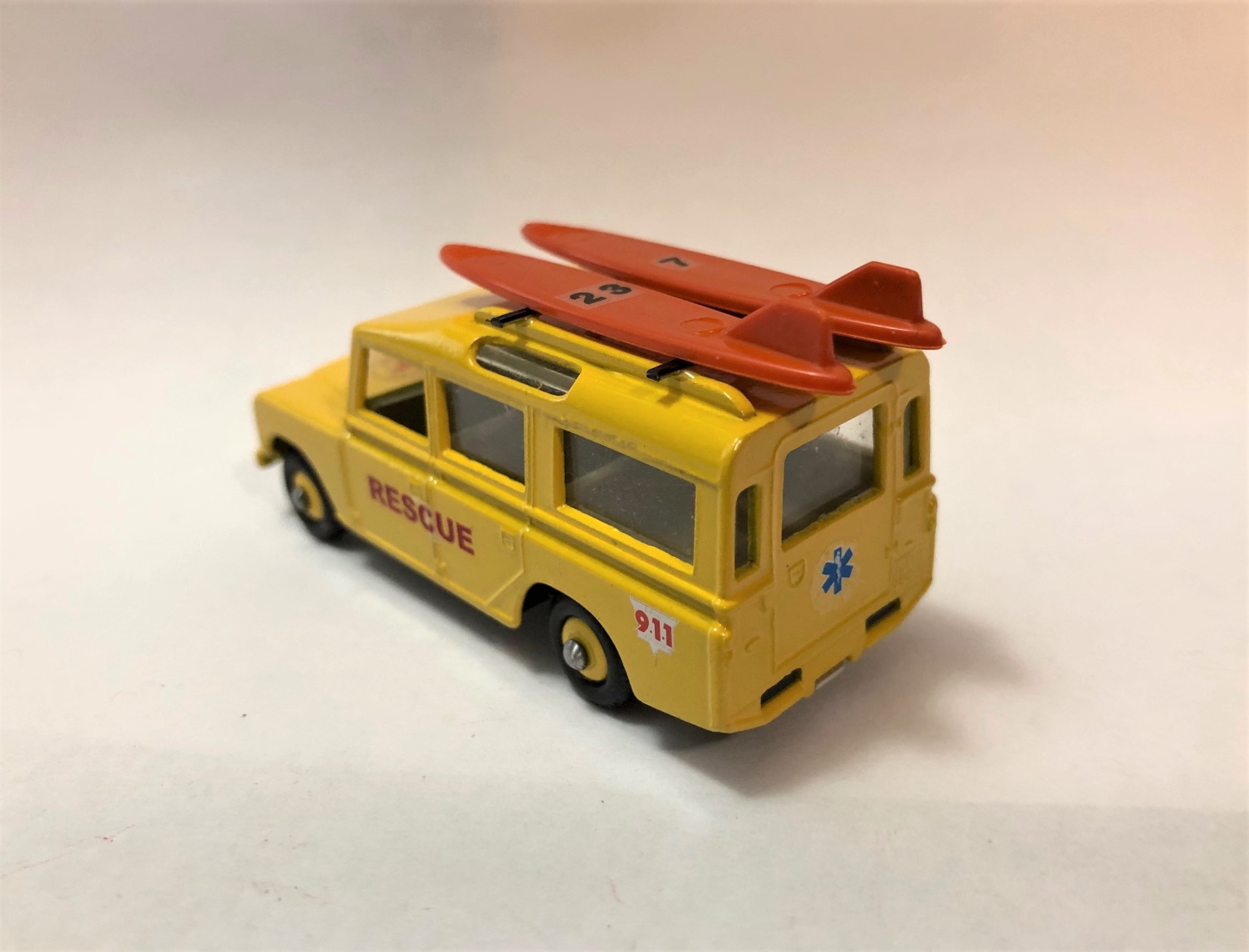 This is very similar to my previous Land Rover rescue vehicle with the Zodiac raft on the top. I got rid of the excess casting junk on the roof (that held the plastic luggage) and install some roof rails with adjustable cross bars. The other Landy was sort of a generic water rescue vehicle, this one is a beach rescue/lifeguard vehicle. Where I live, the lifeguards use surf boards to quickly get out beyond the breakwater and make a rescue. Hence the two surf boards latched down on the new all metal roof rack (only the surf boards are plastic). I upped my game on this one and went with matching painted wheel hubs and tires instead of the ole one piece black plastic wheels. I like the new wheels and tires much better. I'm considering painting the front bumper medium grey and detailing the headlights and grille. I hope a few of you might like it, I know I enjoyed making it! I've included the before pics along with a couple different views of the (maybe) finished model.