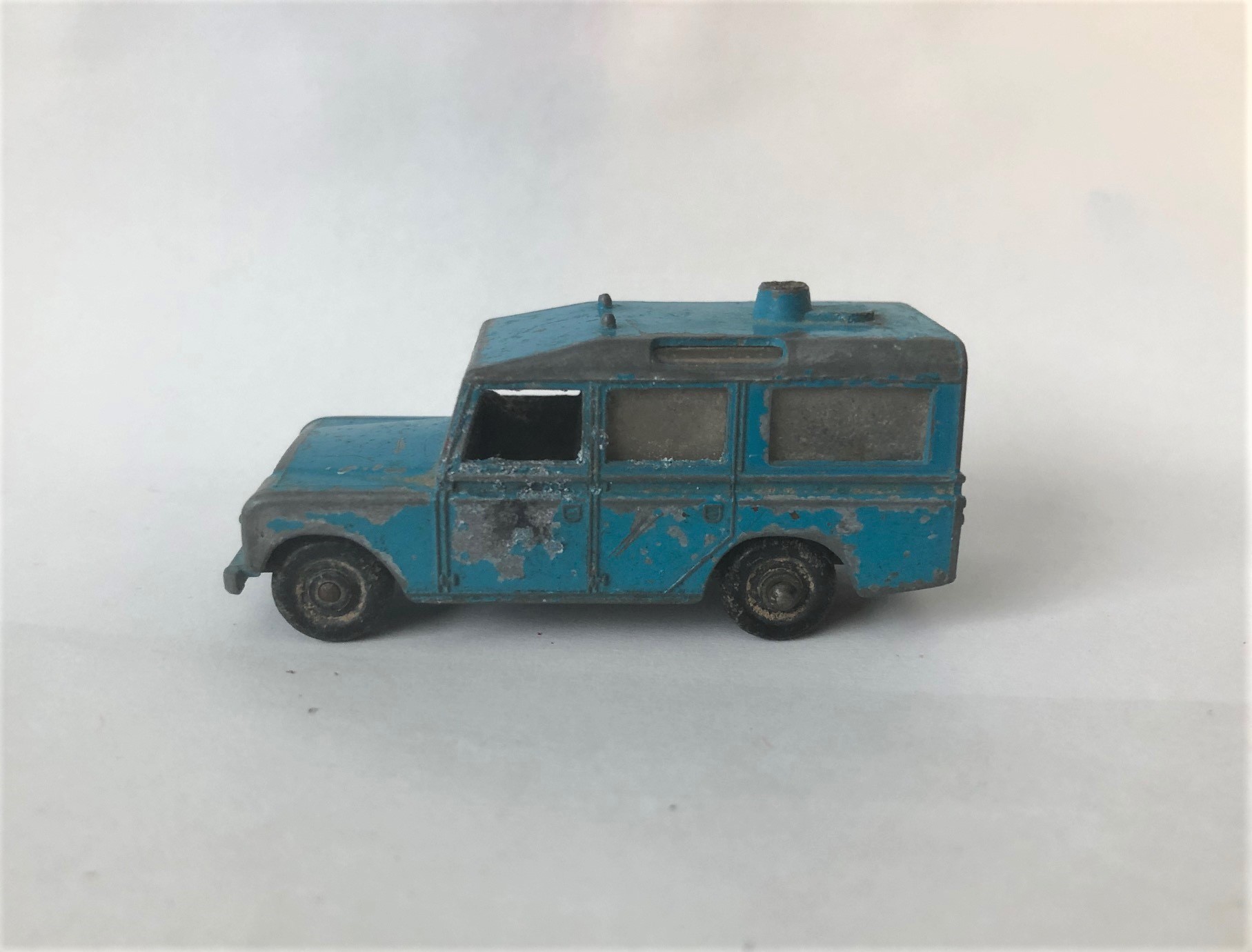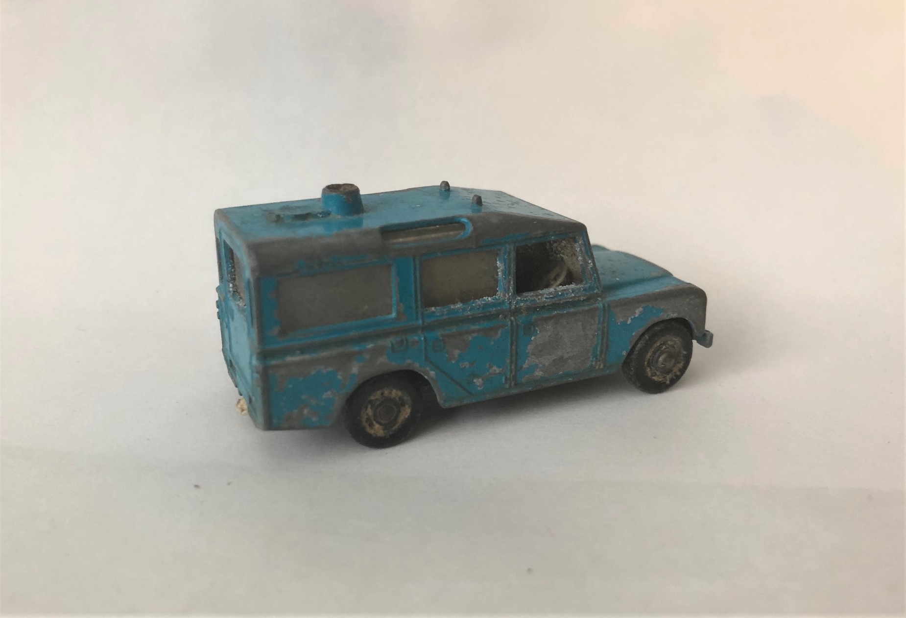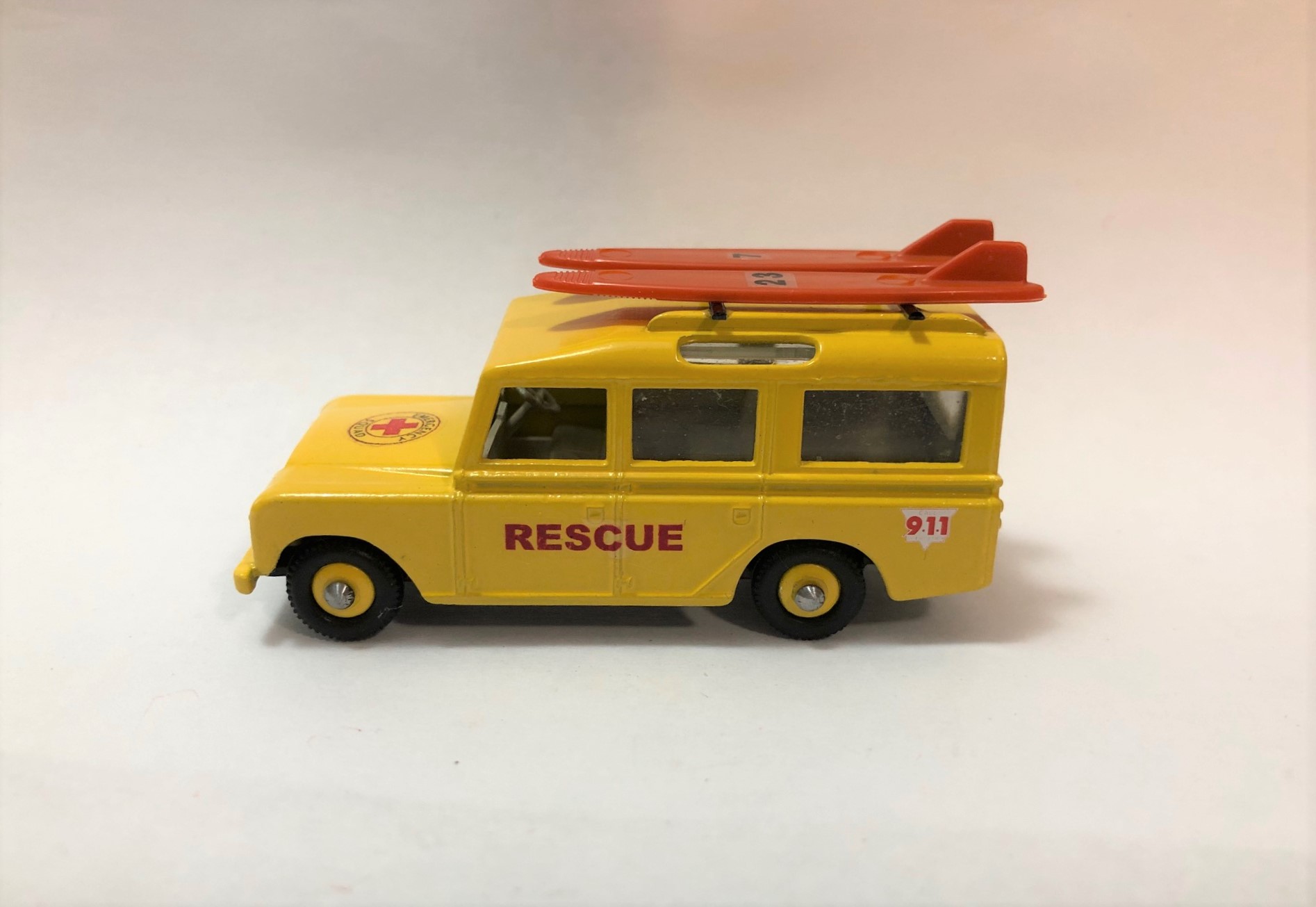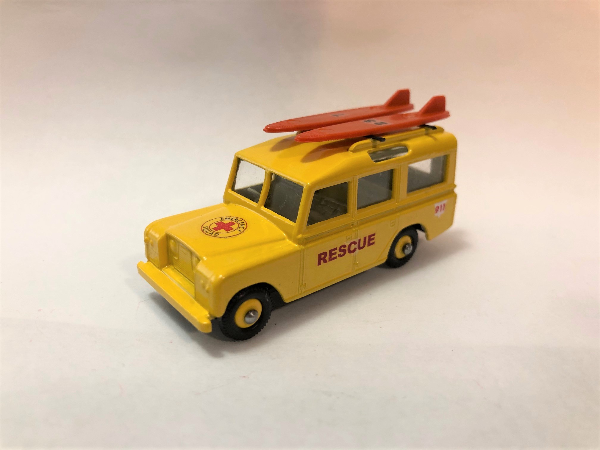 This is very similar to my previous Land Rover rescue vehicle with the Zodiac raft on the top. I got rid of the excess casting junk on the roof (that held the plastic luggage) and install some roof rails with adjustable cross bars. The other Landy was sort of a generic water rescue vehicle, this one is a beach rescue/lifeguard vehicle. Where I live, the lifeguards use surf boards to quickly get out beyond the breakwater and make a rescue. Hence the two surf boards latched down on the new all metal roof rack (only the surf boards are plastic). I upped my game on this one and went with matching painted wheel hubs and tires instead of the ole one piece black plastic wheels. I like the new wheels and tires much better. I'm considering painting the front bumper medium grey and detailing the headlights and grille. I hope a few of you might like it, I know I enjoyed making it! I've included the before pics along with a couple different views of the (maybe) finished model.