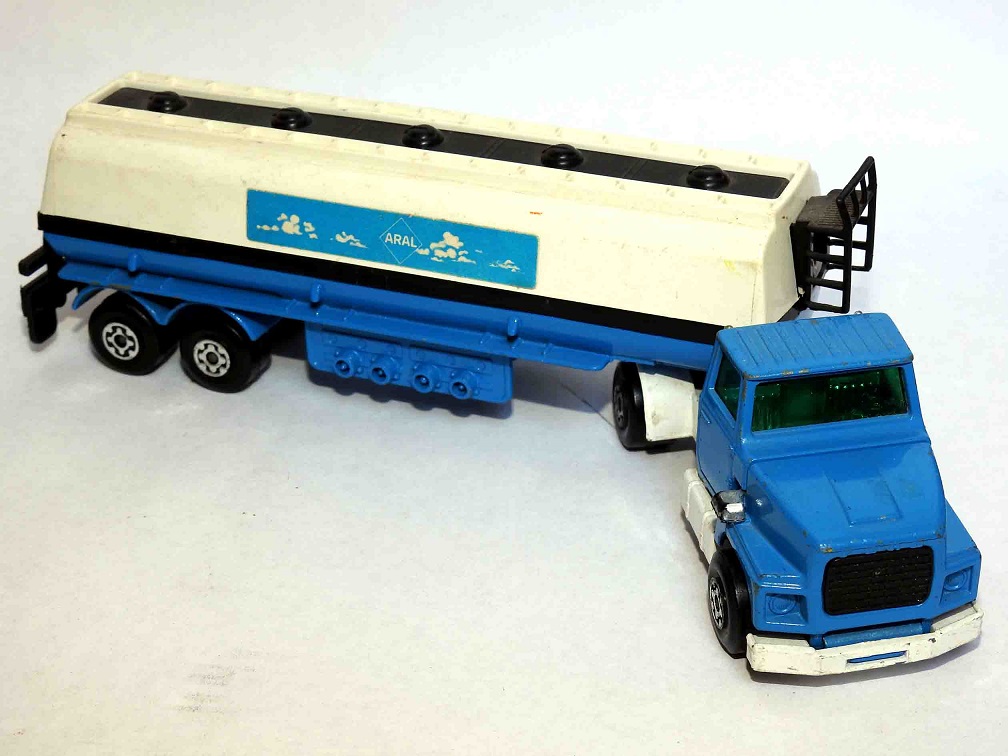 - 2. Lt blu cab/slv base type 3/lt.org xle cvr f.fwd/blk 5th type A/blk rad/ss/grn wind/type 2 trailer/Wht ARAL on blu/wht hoses/chrm top/lt.tan opn xle cvr/blk plastics.