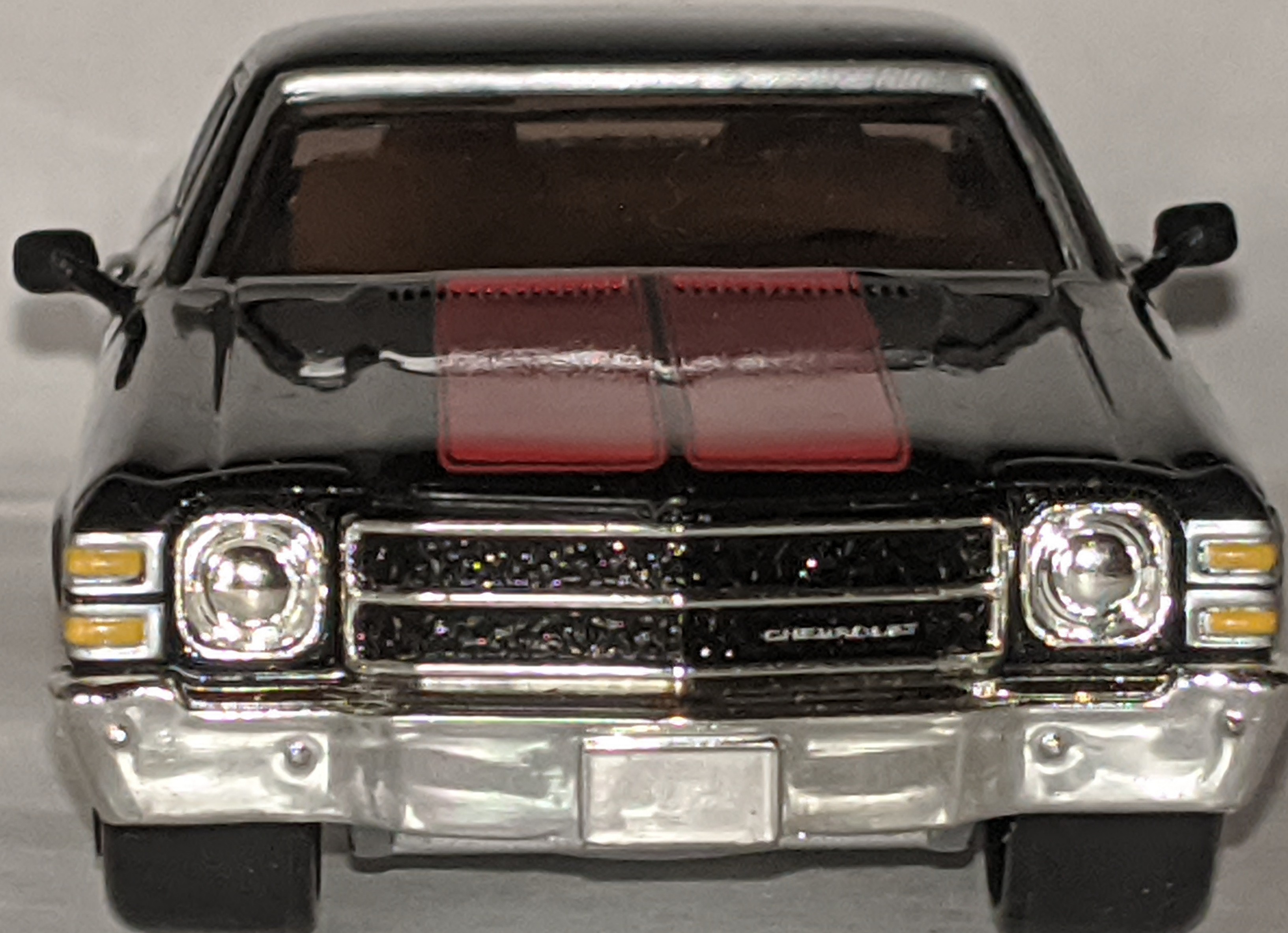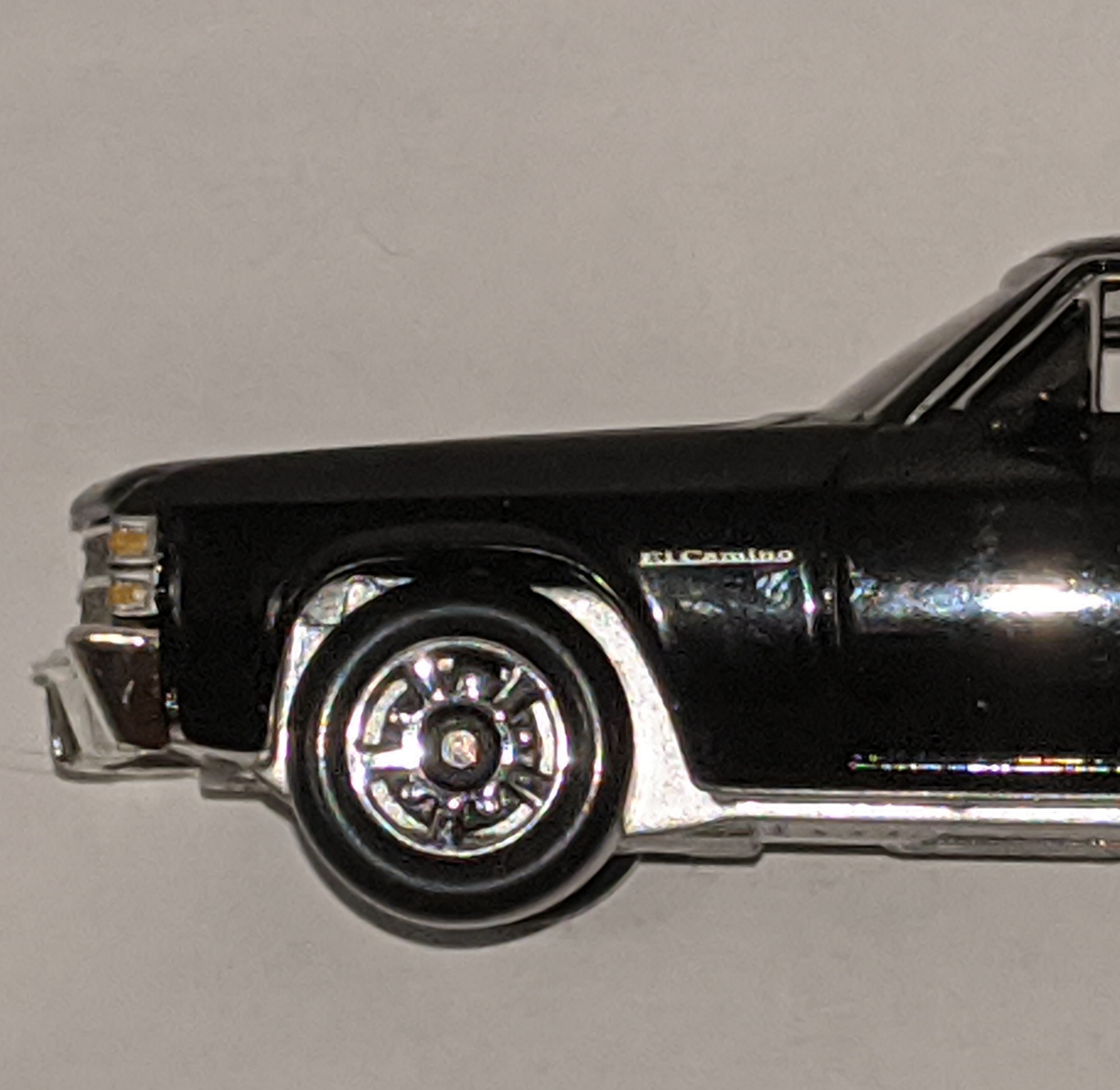 The El Camino is an interesting piece. It sports the "Band-Aid" stripes, yet lacks the cowl-induction hood and Super Sport badging. One could order the stripes on standard Chevelles and El Caminos, but I imagine not many were so equipped. And I can't quite read the badge on the grill; does it say "Chevrolet" or "Chevelle?"