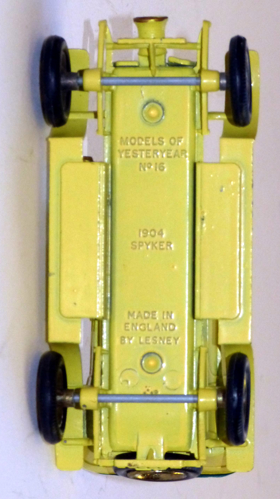 I have a Matchbox Y-16-1 1904 Spyker that I'm pretty sure has been factory-overpainted. Green can be clearly seen underneath the factory yellow and, in my meagre research, I found out that the 1960 or 1961 Matchbox catalog shows a two-tone green one which, so I understand, was never released. For those naysayers who might think someone did this on purpose after the fact, I can tell you I'm the original owner and only noticed it a couple days ago. So, I'm looking for more info from those more knowledgeable than me. I tried uploading several pics showing all sides and the bottom, but this is the only one that loaded. Might need some advice on how to do that.