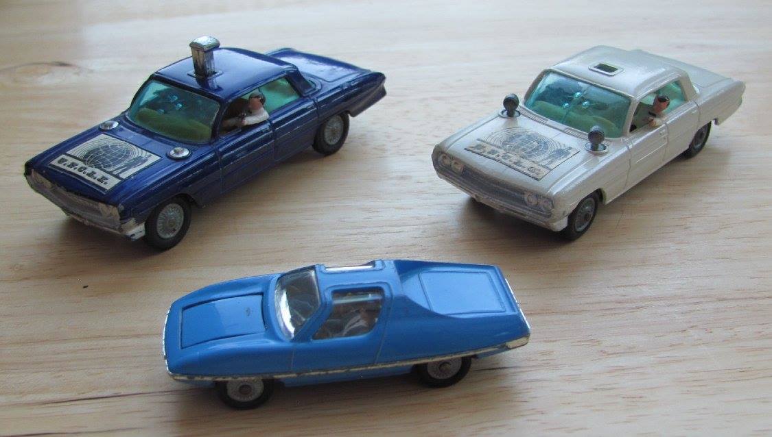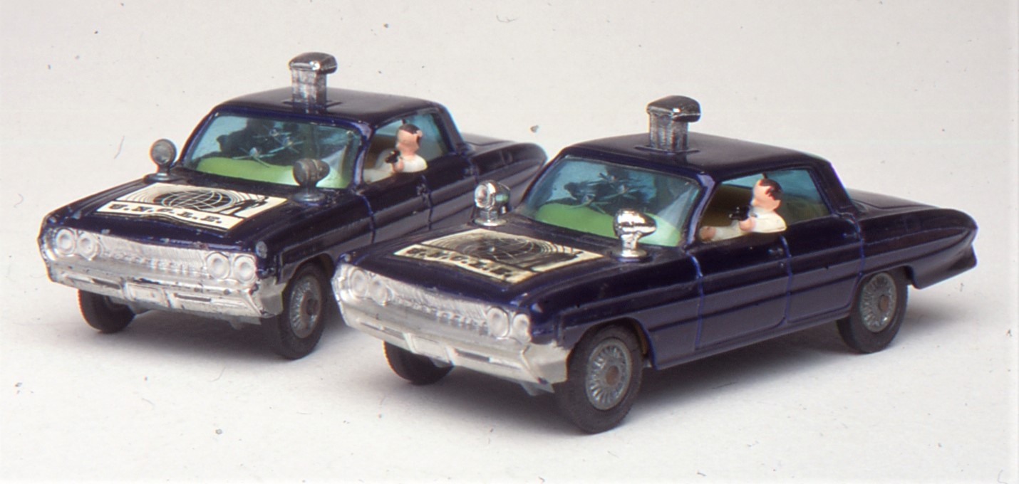 The 1961 Oldsmobile Super 88's were released by Corgi in 1962 as a black and white Sheriff's car (#237) and a metallic mauve and white or a pale blue and white civilian car (#235), both with red interiors. There was also a drab green US Army Staff Car (#358) added in 1964 to squeeze some extra mileage from the casting. Those three models were withdrawn in 1966 when the tooling was altered to produce the Man from U.N.C.L.E. versions sold as "Thrushbuster's" (#497). The first issues were cream with cream interior, metal wingtop spotlights and no raised lip for locating the bonnet sticker. These versions are quite rare as Corgi soon changed the Thrushbuster cream (joke not lost on me) to metallic purple with a yellow interior, plastic wingtop spotlights and a raised lip to locate the bonnet sticker. The rear facing periscope on both could be pressed to allow Napoleon Solo and Illya Kuryakin to duck in and out alternately whilst shooting their guns ... with gunshot sounds as well.