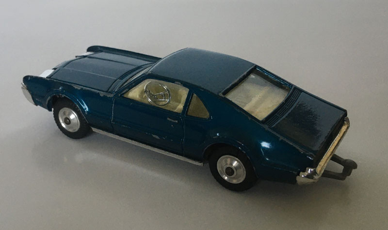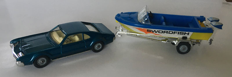 The blue Toronado also appeared in Gift Set 36 towing a speedboat. My example is missing the figures from the boat - apparently there were "teething problems" at the Swimming with Sharks Experience. When the boat's on the trailer it looks better without occupants anyway.