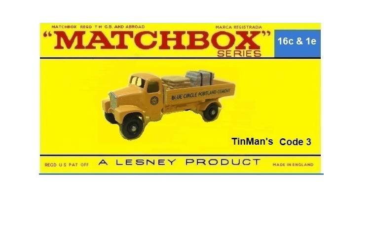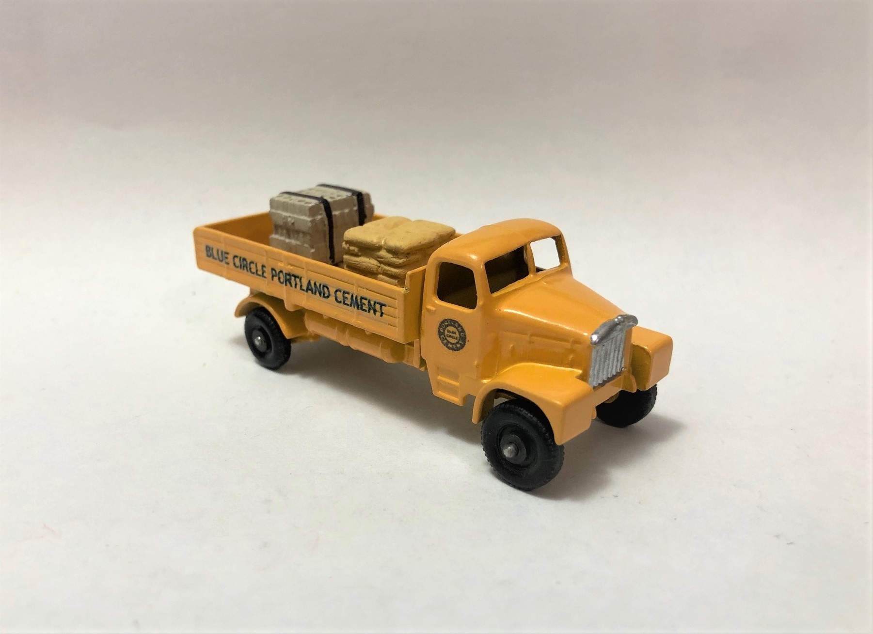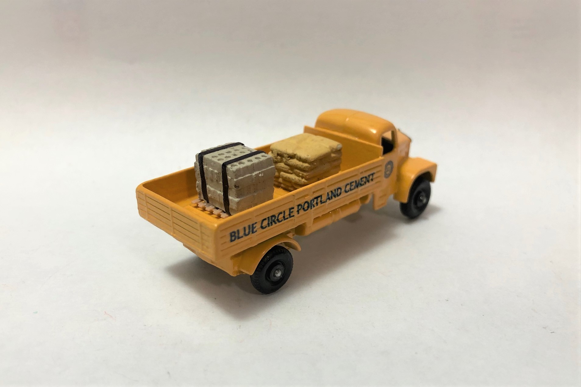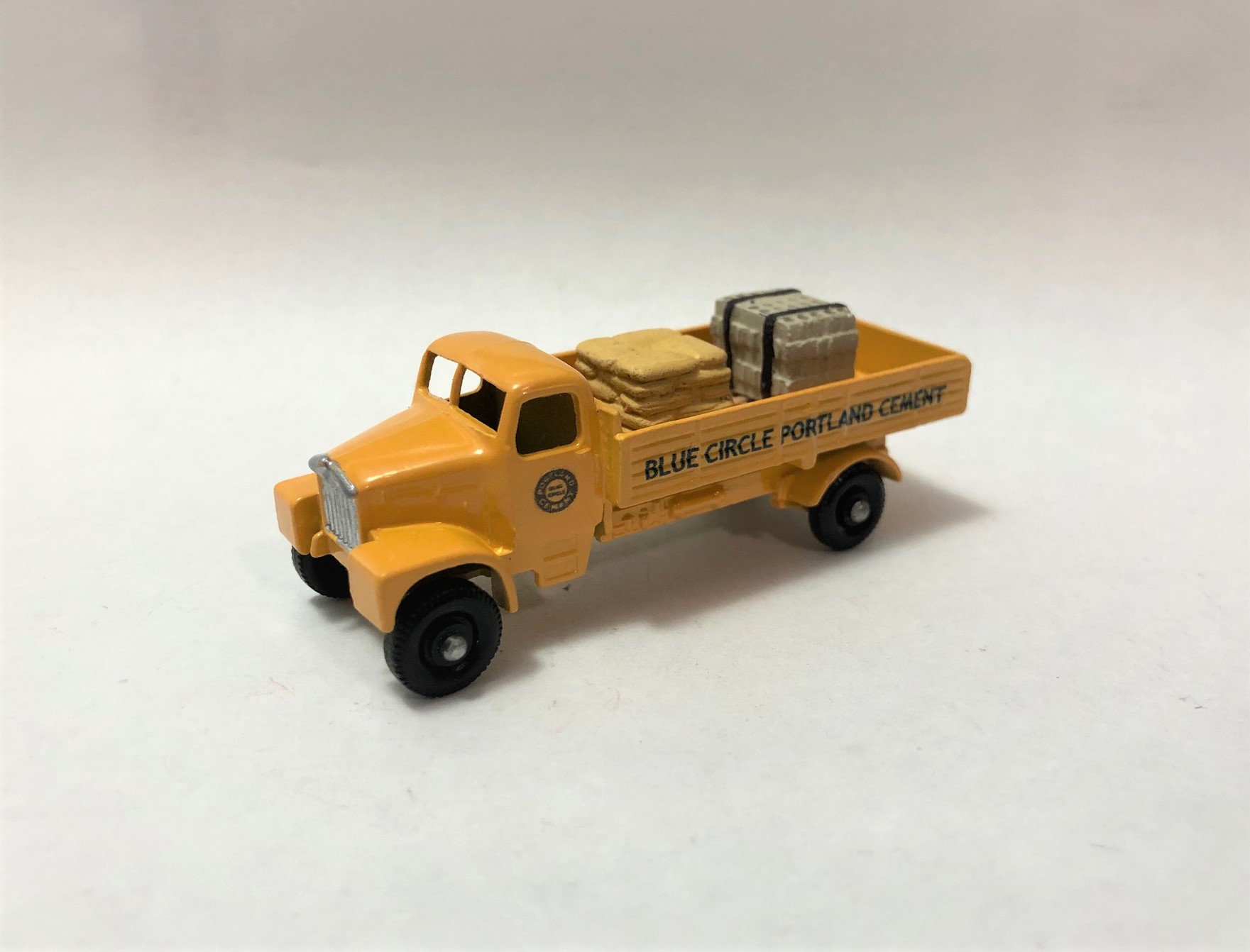 The long, long truck! Another 16c, which was missing a plow and a dumper bed, was looking to team up with something else. A play worn 1e missing the canvas bed cover, with a broken tow hook and a broken windscreen decided to donate it's bed. A Pallet load of cement bags and another pallet of concrete bricks round out the load. Bricks and cement bags are made from plaster of Paris, the pallets are plastic. The long, long truck gets it's own box too.