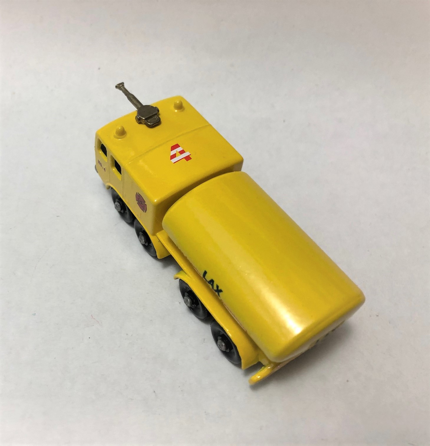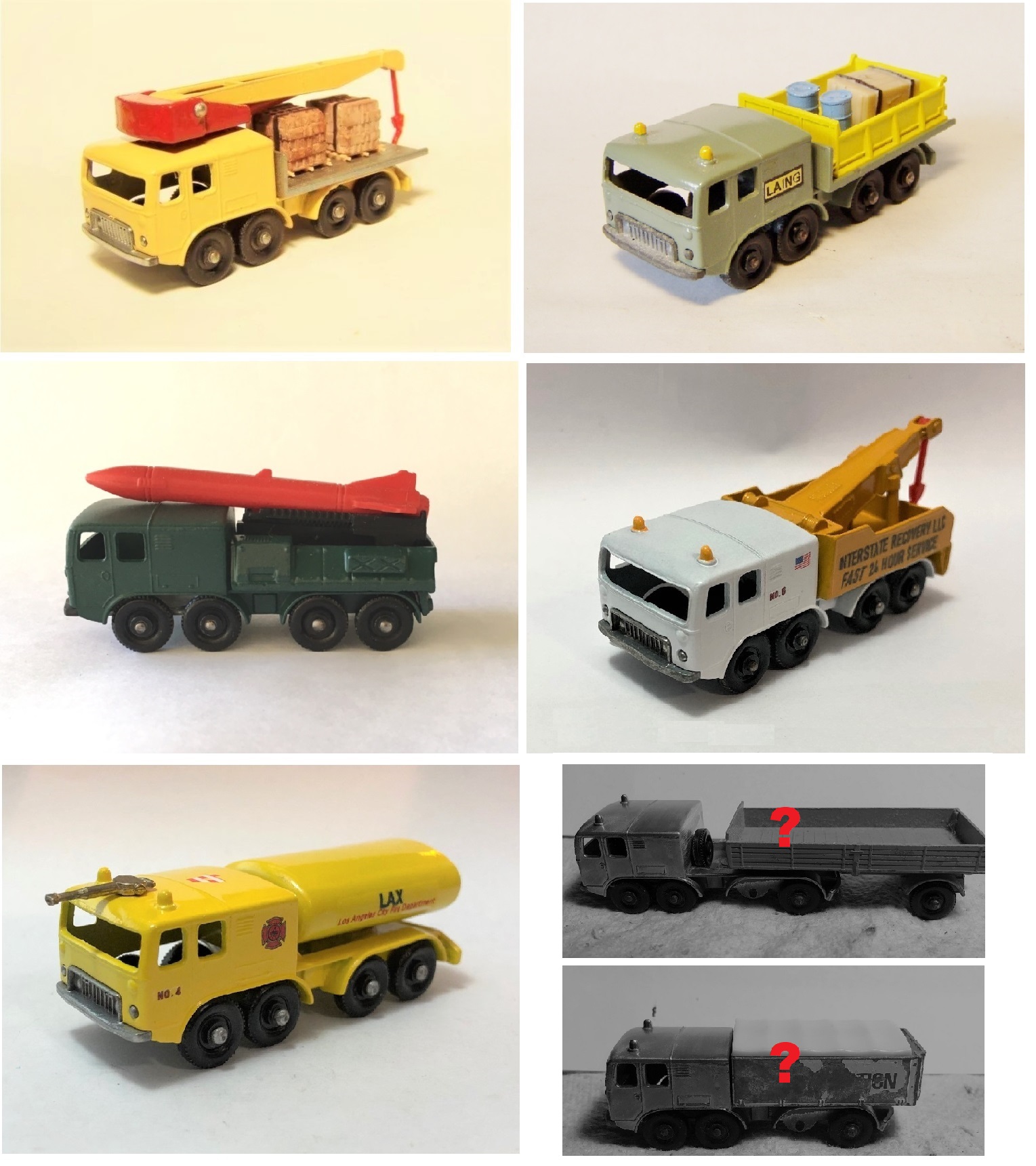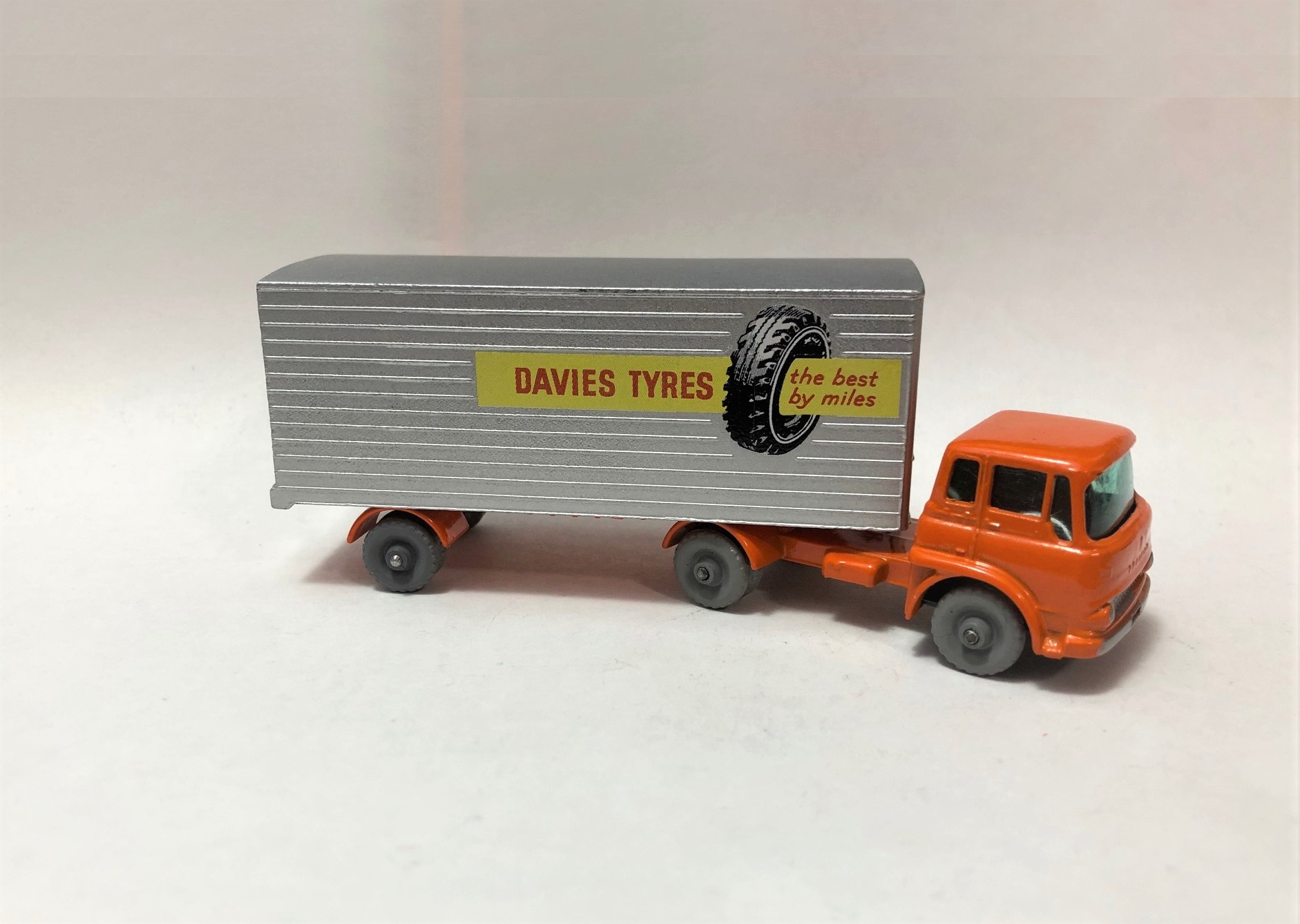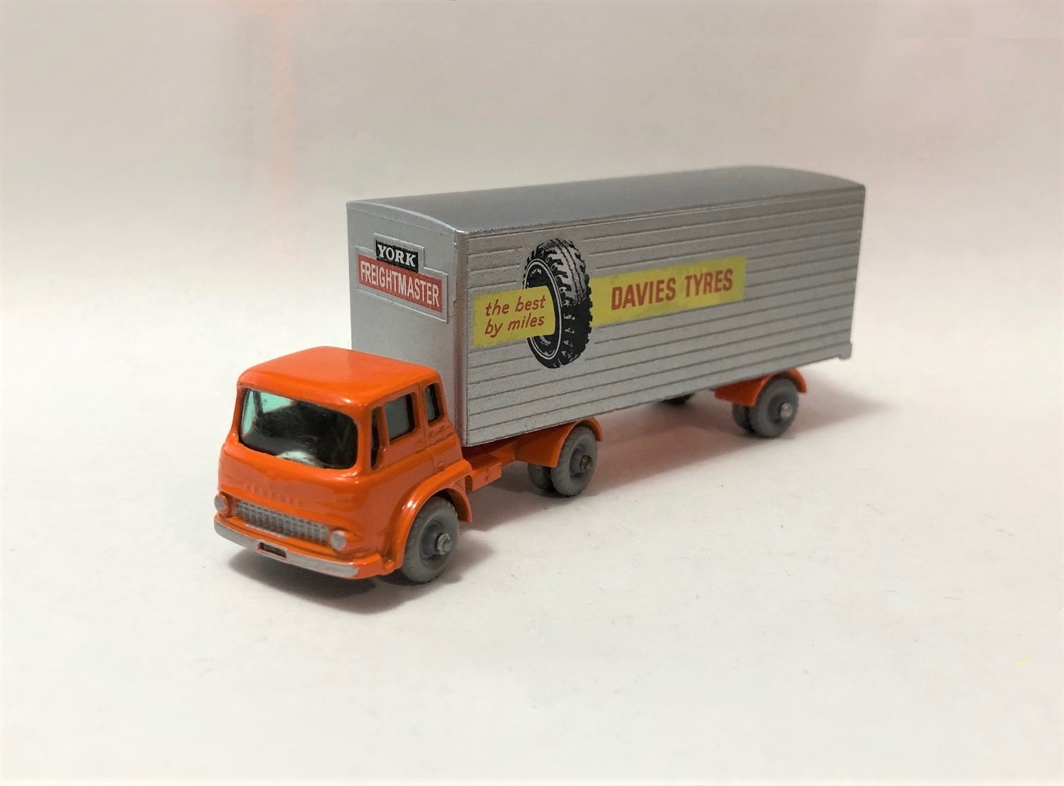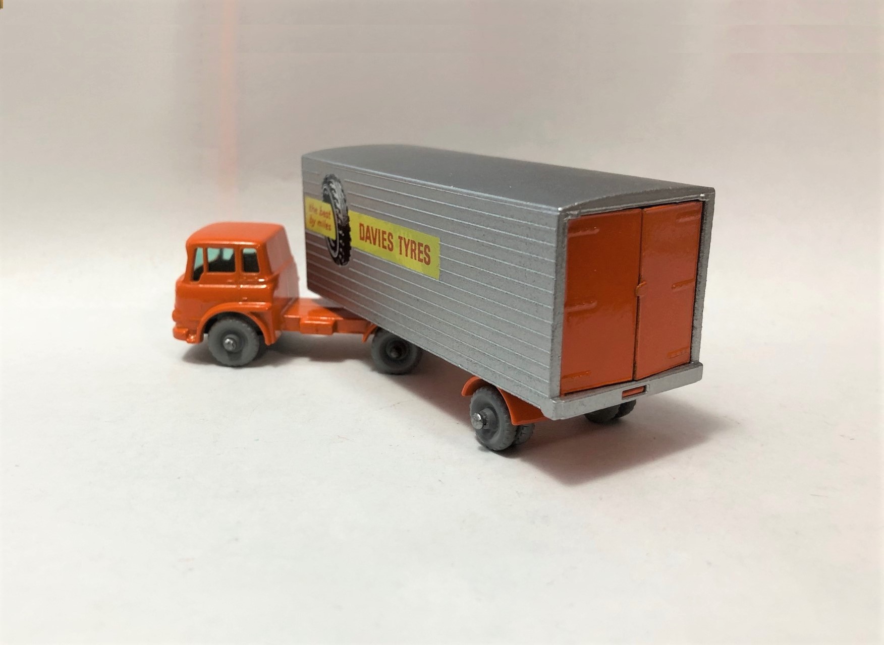 A nice Major Pack M2-b that was overdue for a restoration. The Bedford cab and the trailer were purchased at different times. The trailer had knobby black plastic wheels and the Bedford cab had knobby Grey Plastic Wheels. Six wheels outnumber four, so the whole rig received Knobby Grey Plastic wheels.