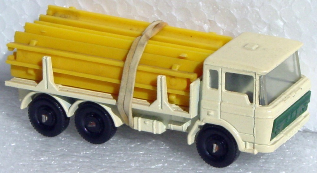 It came without a box and with the pre-pro YELLOW girders. I will now buy another mint and boxed girder truck in an E-Box. Once it arrives I will swap the yellow girders with the red ones and park this one in its box art-matching box!