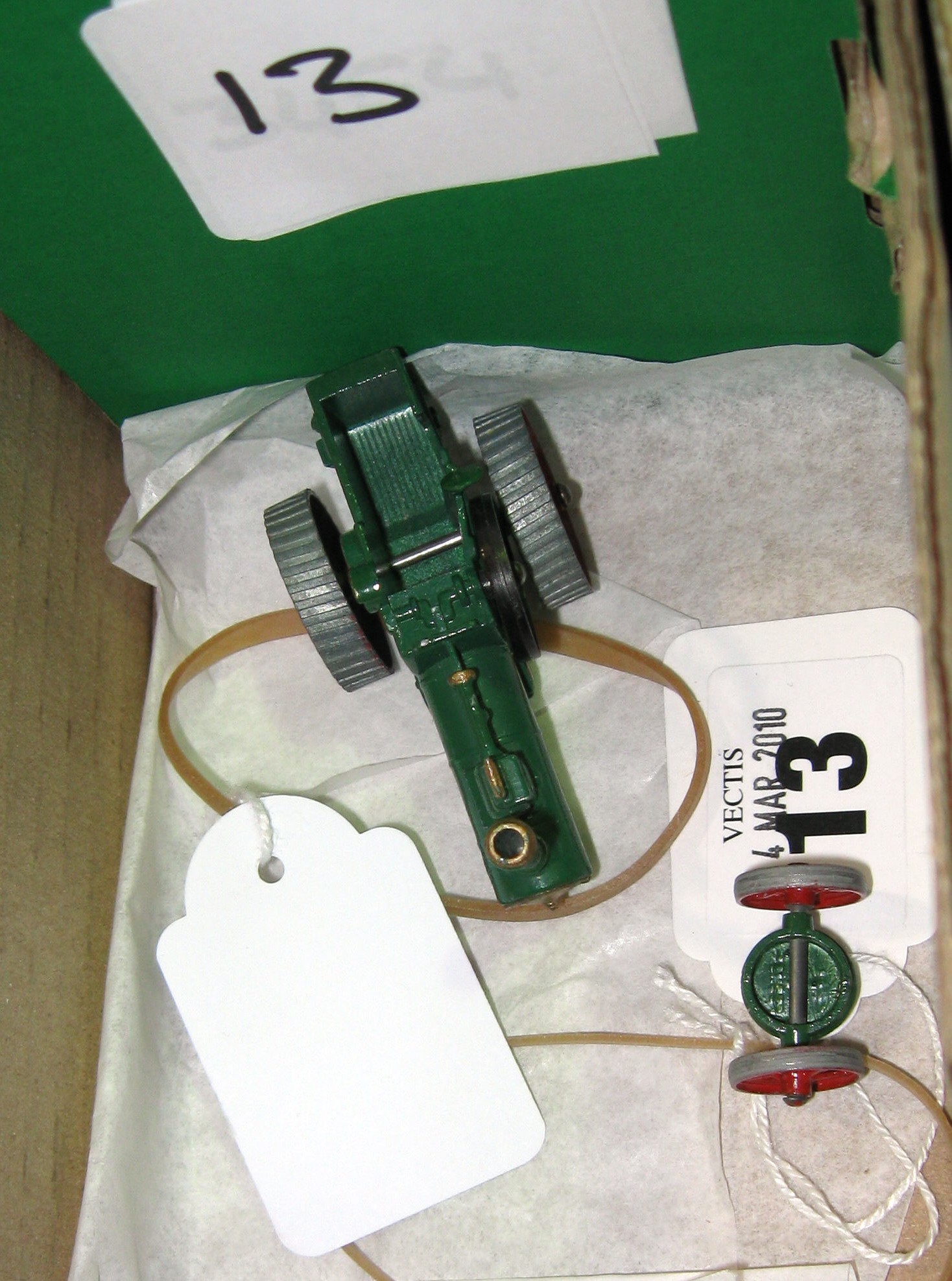 As can be seen here, the rivet was done pre spraying of the model as the green paint overspray covers the rivet head in exact alignment (more paint on front than rear of rivet head ). The front axle passes directly over the other rivet end and is crimped both sides as per rough R&D style ones. All this tells me it was done in the factory. I have seen so many screw versions and considering this section is easy to break presume they have all been repaired at some time. I only know of one other like this and mine was got for a minimal sum from a UK women who originally bought from a toy store for her kids years ago and found them one day again.