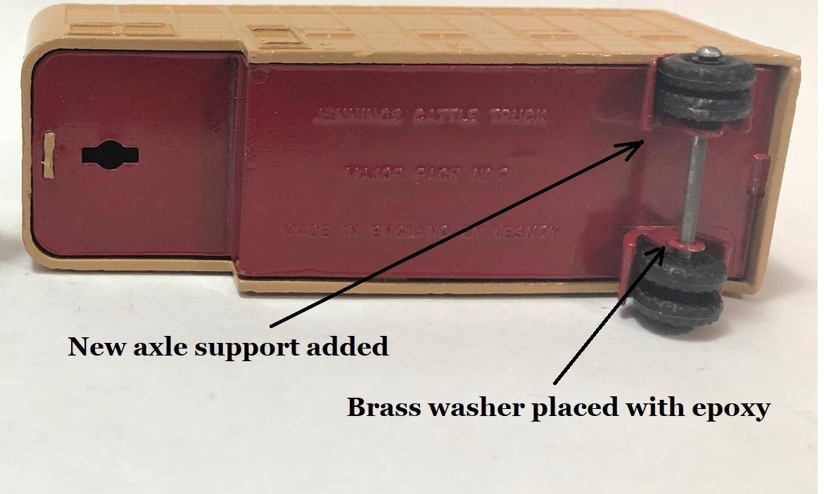 If one wanted, they could make the washer disappear in by adding filler putty to thicken the existing axle support and blend in the washer repair. Since it's almost impossible to see unless you turn the model over, I didn't see any need to go to all that trouble. Nothing goes to waste as some badly damaged models get stripped of anything usable and even the bodies get cut up for spare parts.