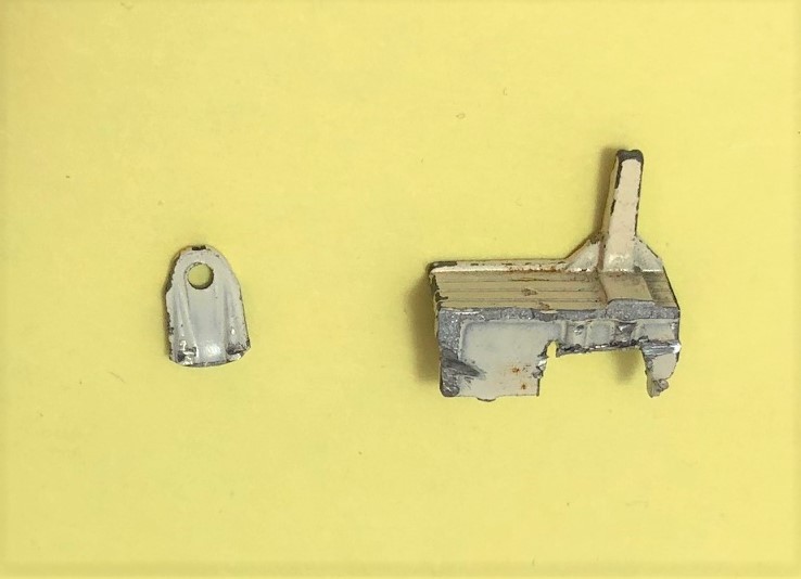 Besides the simple replacement of the above post's M7 rear ramp, here is the repair of the axle supports in more detail. They were broken as described above. In the first picture below, you can see where I've taken an axle support off the remains of a regular wheel Girder Truck. Piece on the right is what it was cut from, piece on the left is the cut away part that was transplanted on the M7 trailer. In the last photo you can see the transplanted axle support and the repair I made on the existing (but damaged) support. I used a small brass washer to repair the missing portion of the axle support.