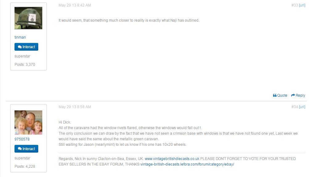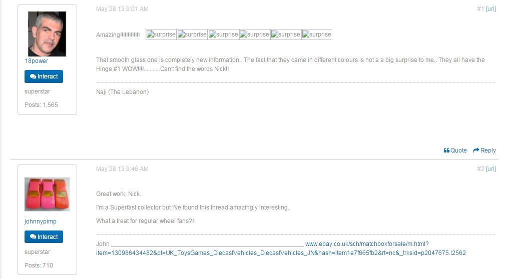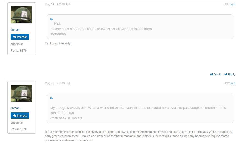 kwakers wrote:I shared that variation with Antonin when John's Lesney Legacy name came up in a PM, but Diecast had missed John picturing that one very well in one of his E Bay sales. Antonin did not seem to know about that very early casting, but someone in our hobby now has that one in their collection. Unique? probably not. Have any of us ever checked our already hard to find green 43As webbing? I know I never had until I saw John's listing last year with his excellent pictures of the Post without any webbing. kwakers