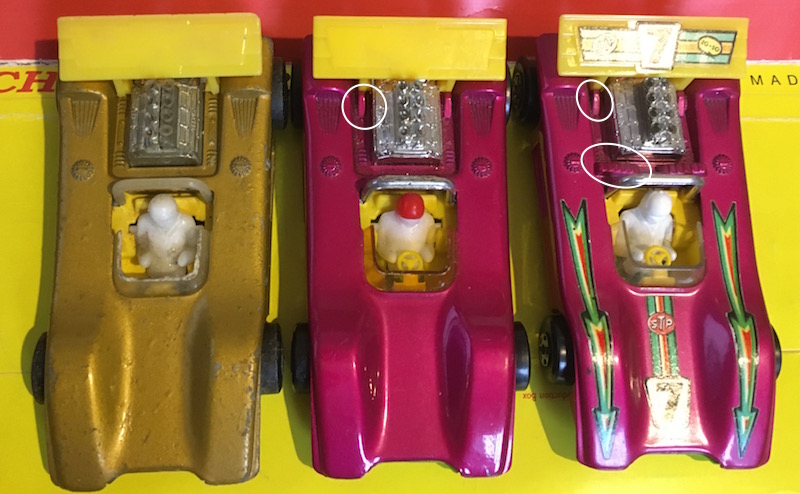 - 10. Burgundy body/lime green Speedkings base/dk.amber windshield/dark yellow interior & airfoil/tan driver/large tan helmet/"7" & "STP" labels.