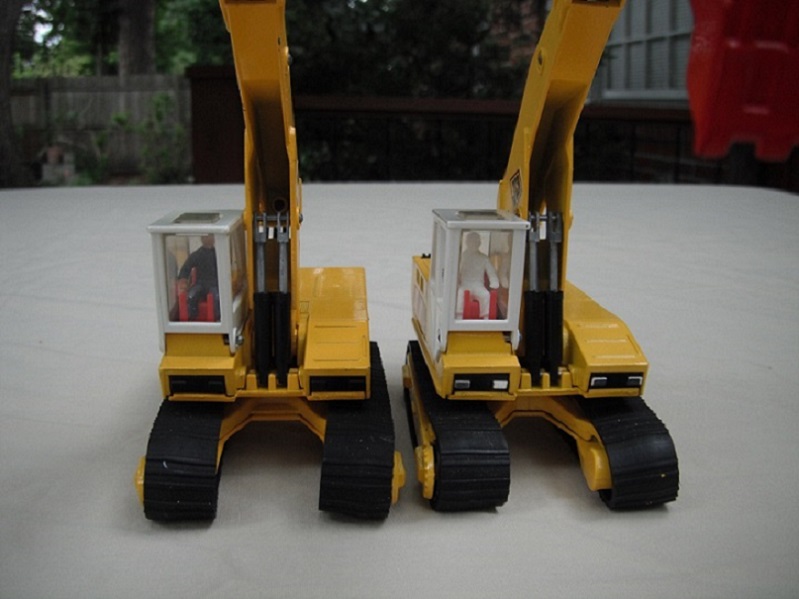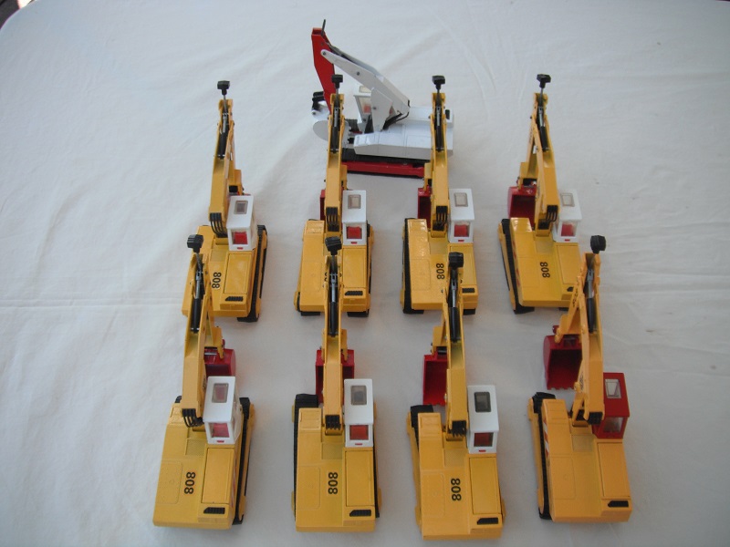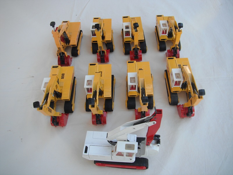 9. Yel body/red cab/dk.red scoop/China/clear windows/tan int/chrome headlts/no driver/JCB & 808 tampo on jib/red & wht stripes tampo on body.