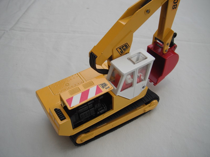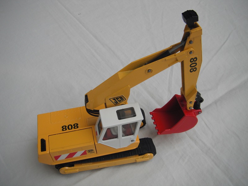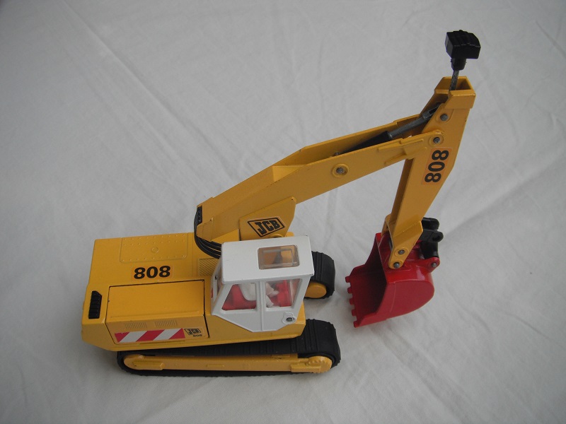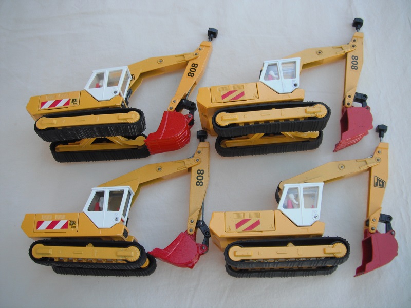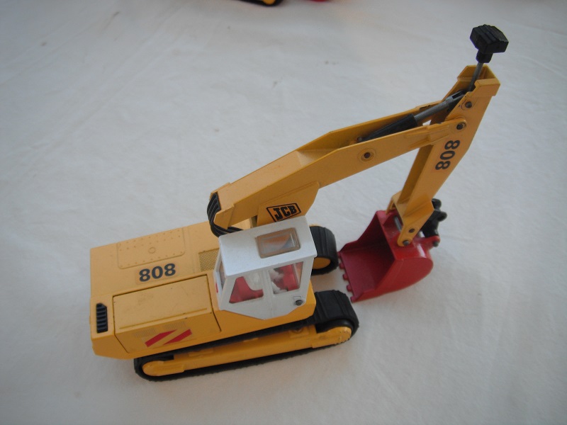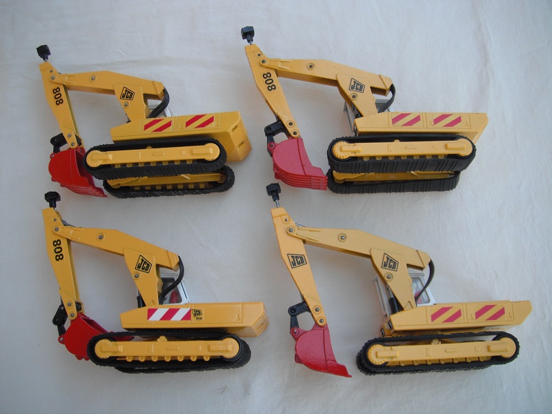 4. Yel body/wht cab/red scoop/England/clear windows/red int/chrome headlts/wht driver/JCB & 808 labels on jib/808, red/wht stripes & JCB on body.