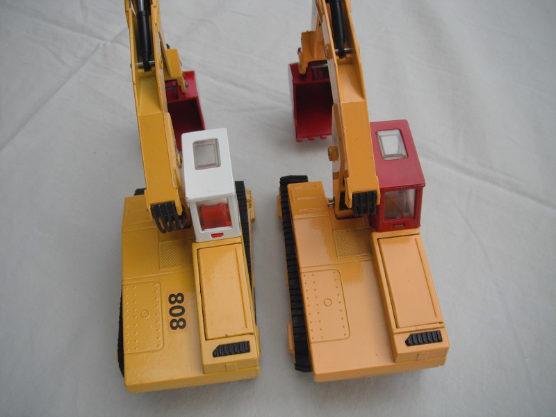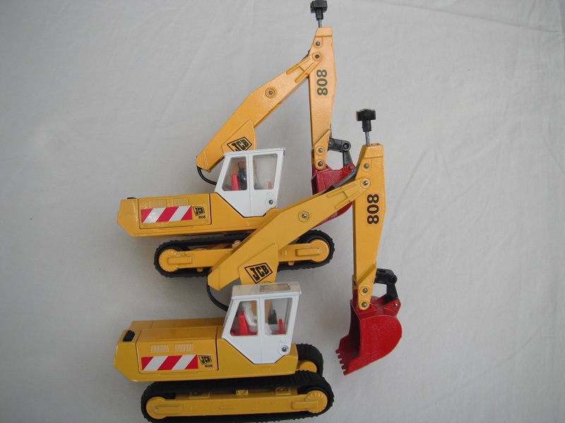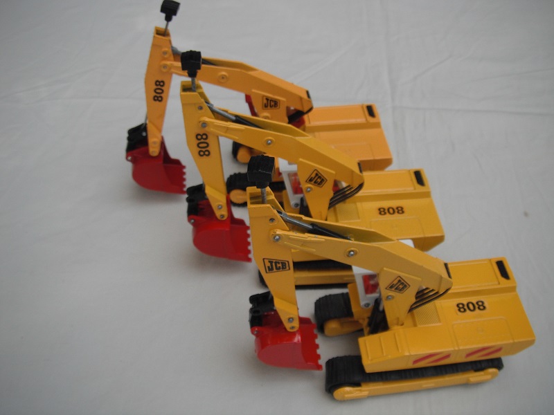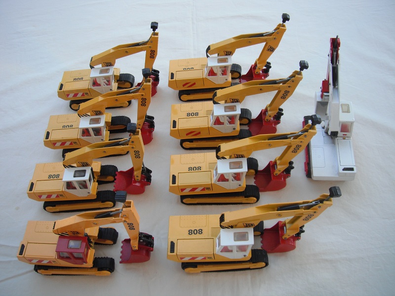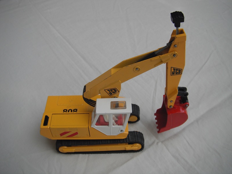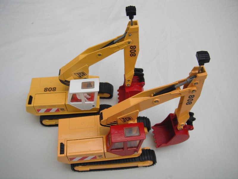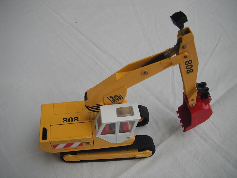 4. Yel body/wht cab/red scoop/England/clear windows/red int/chrome headlts/wht driver/JCB & 808 labels on jib/808, red/wht stripes & JCB on body.