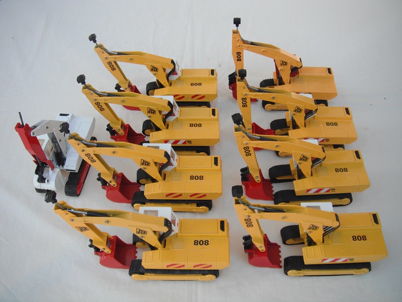 8. Yel body/wht cab/red scoop/England/dk.tinted windows/red int/black headlts/wht driver/JCB & 808 labels on jib/808, red/wht stripes & JCB on body.