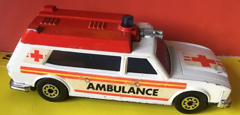 - 7. White body/dk.red roof/gloss black Speedkings base/clear windows/blue dome light/dk.red interior/ambulance labels.