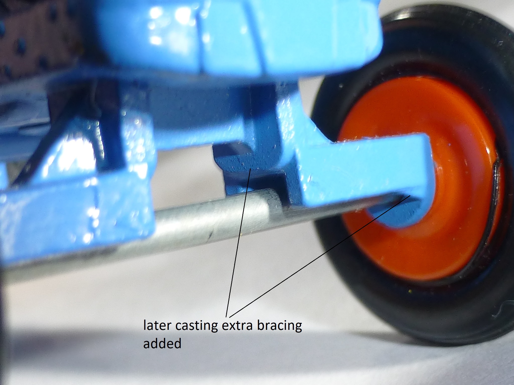 The casting difference on the K11a with orange metal hubs/unpainted steering wheel is on the front axle assembly where the frame is thin and on later versions a curved brace or thickening has been added and also extra webbing. See images