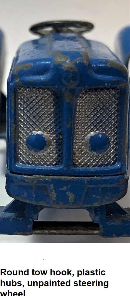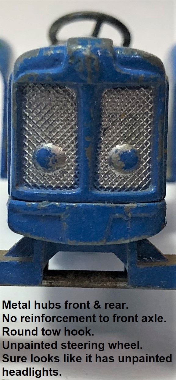 On a less depressing note, I wonder where the variation with silver grille, WITHOUT painted headlights fits in the time line. I have one of those too, it has orange plastic hubs and a round tow hook.