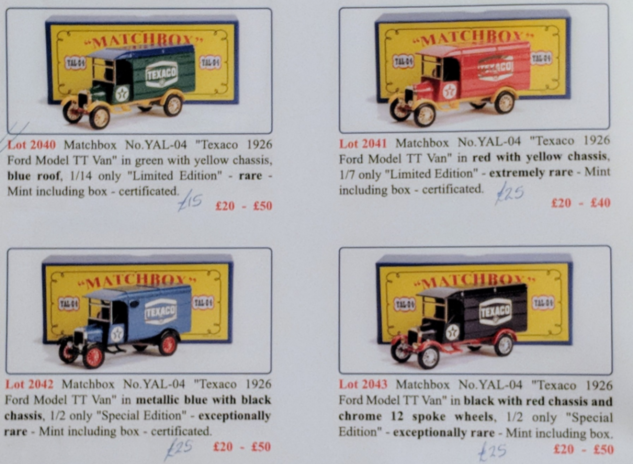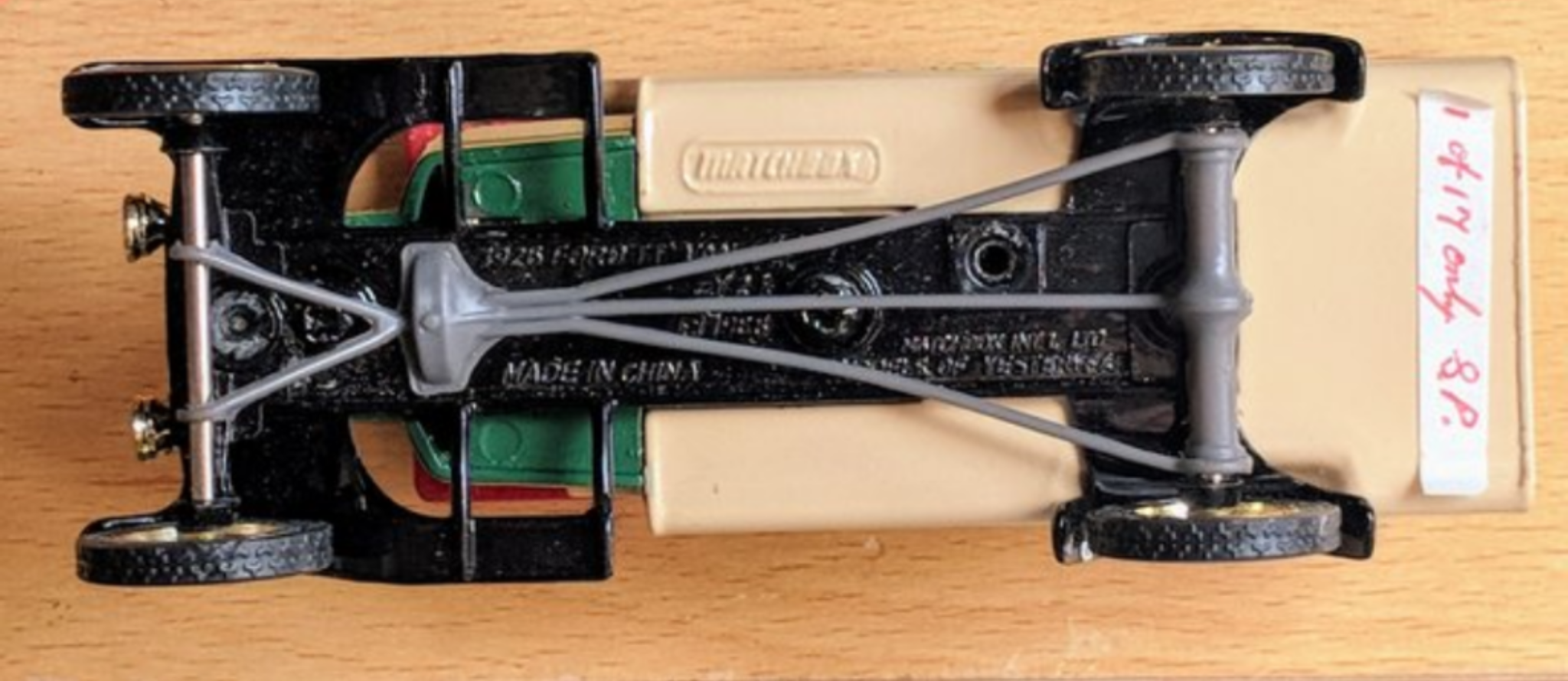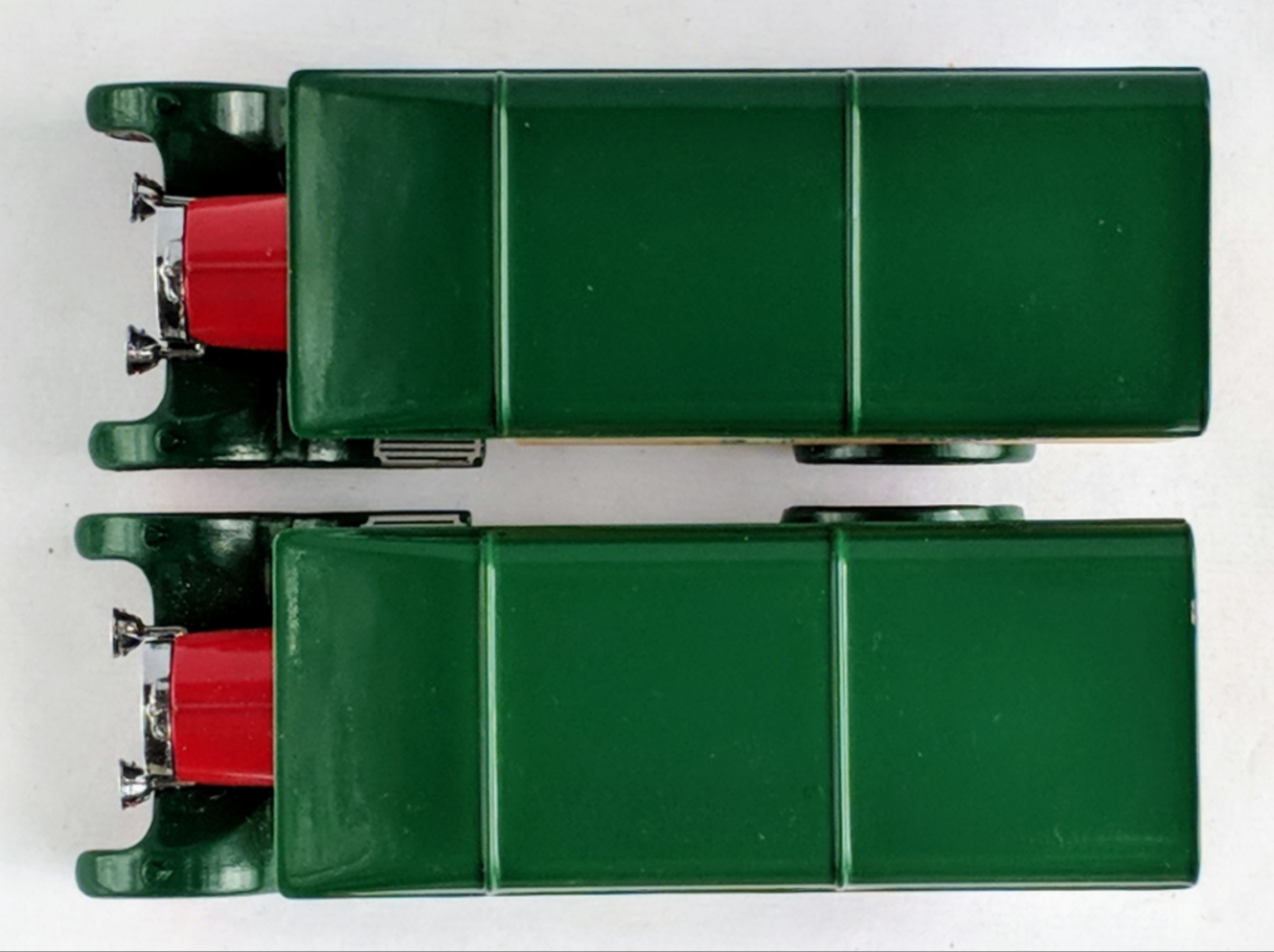 The green roof on the model without the oval window in the side of the van (upper model in these photos) is darker than the model with the window. The baseplate is also different, lacking the cast legend YGB02, being a later issue with the YGB02 model number tampo printed on the donor model. The red roof model is darker than a standard YGB02 Beck and Co model It is also lacking the cast legend YGB02, being an original Y21 donor model. This is just about visible in the close-up photo below As can be seen the baseplate details are mostly cast on the chassis rather than the underside of the van body, so no reference to Matchbox Collectibles. Note the sticker denoting it's a limited edition of only 17 and the single screw hole originally used to fix the model in the Type N display box. Finally, here's a photo from Horace Dunkley's auction showing 6 different green roof models. Sadly the descriptions are generally not detailed enough.