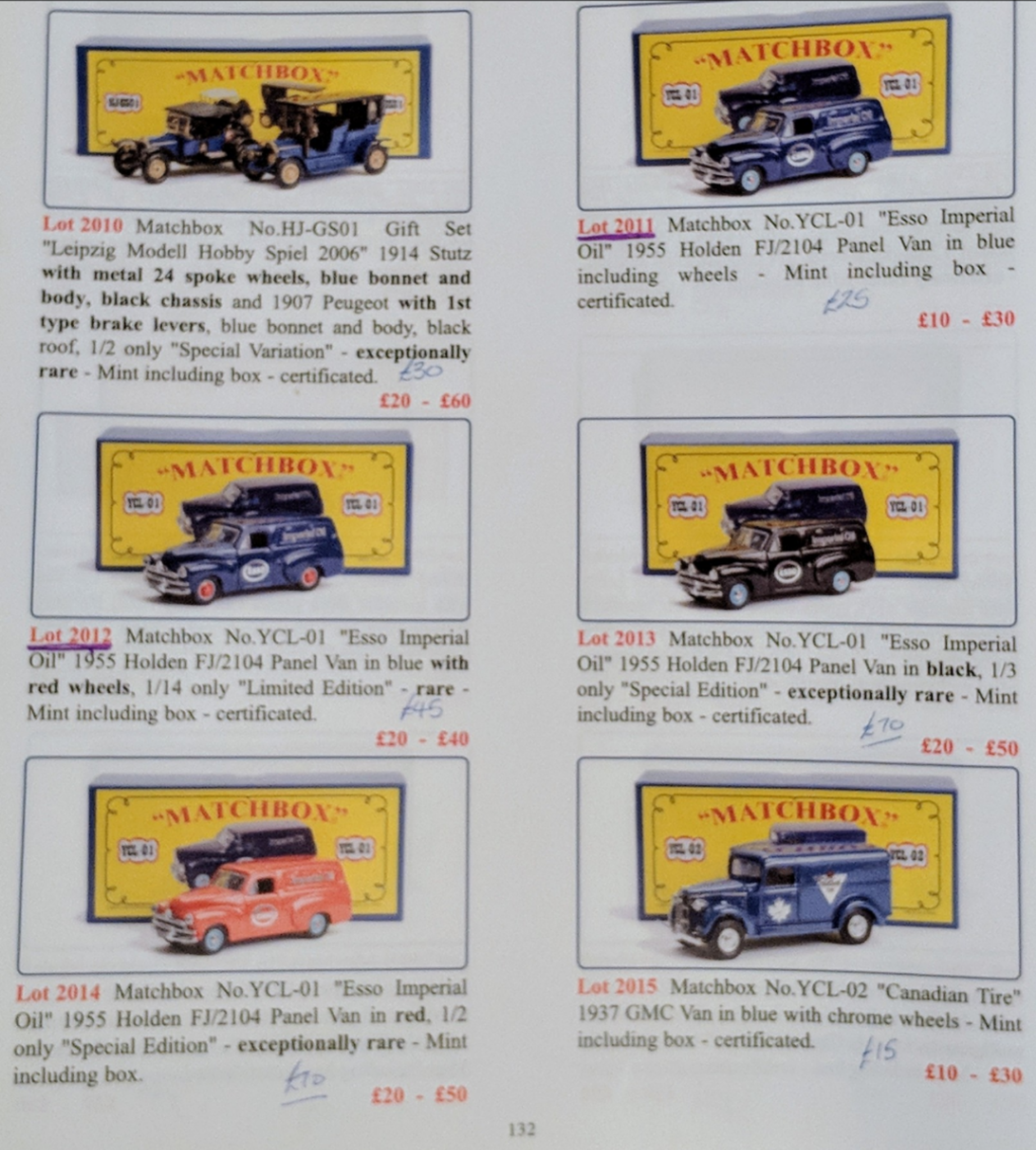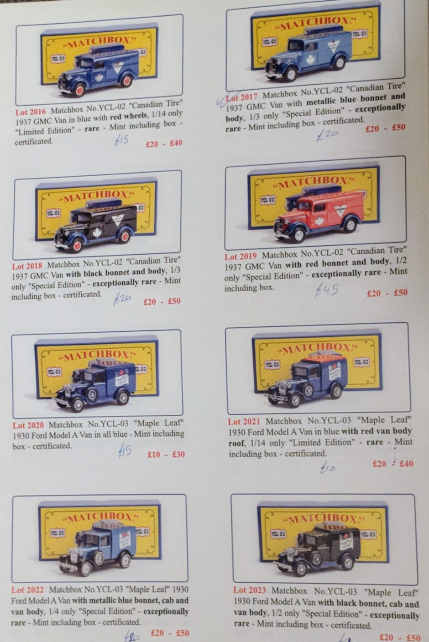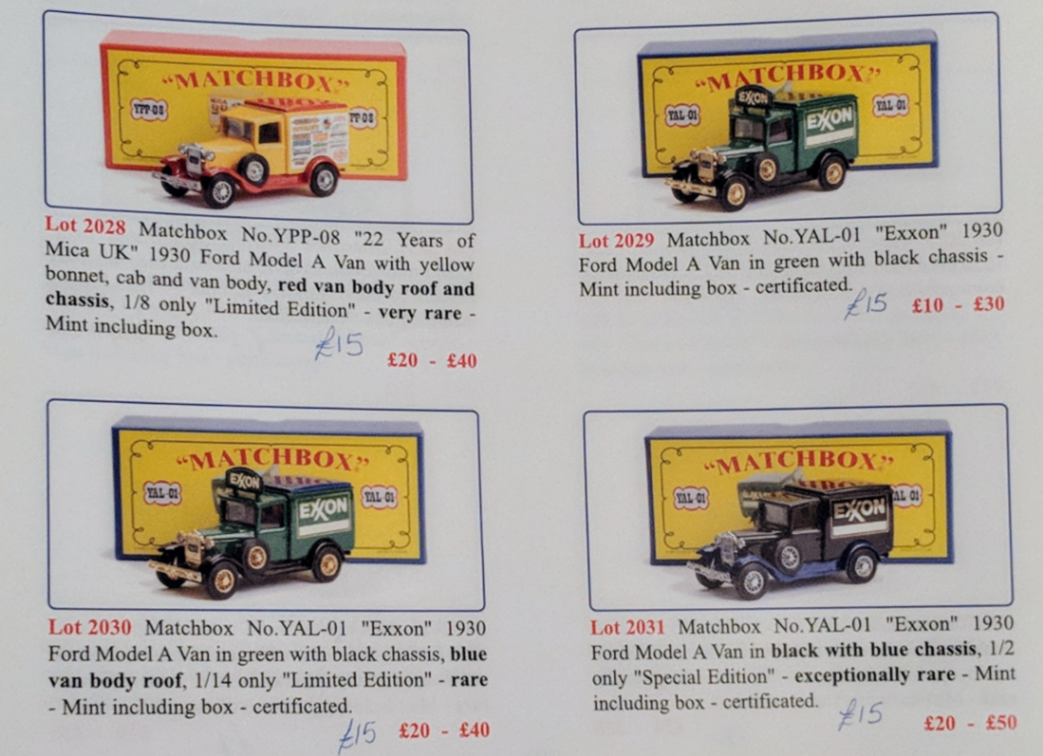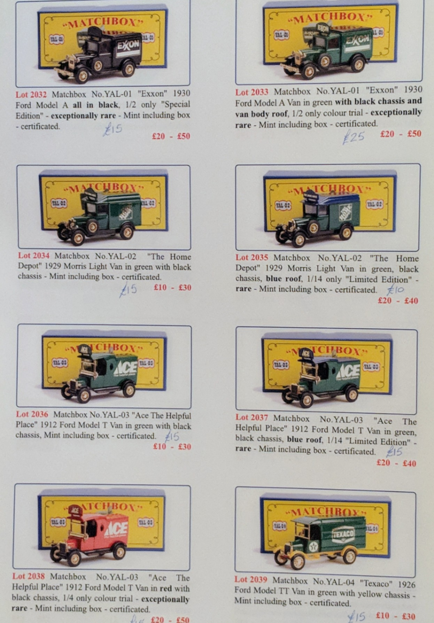 The green roof on the model without the oval window in the side of the van (upper model in these photos) is darker than the model with the window. The baseplate is also different, lacking the cast legend YGB02, being a later issue with the YGB02 model number tampo printed on the donor model. The red roof model is darker than a standard YGB02 Beck and Co model It is also lacking the cast legend YGB02, being an original Y21 donor model. This is just about visible in the close-up photo below As can be seen the baseplate details are mostly cast on the chassis rather than the underside of the van body, so no reference to Matchbox Collectibles. Note the sticker denoting it's a limited edition of only 17 and the single screw hole originally used to fix the model in the Type N display box. Finally, here's a photo from Horace Dunkley's auction showing 6 different green roof models. Sadly the descriptions are generally not detailed enough.