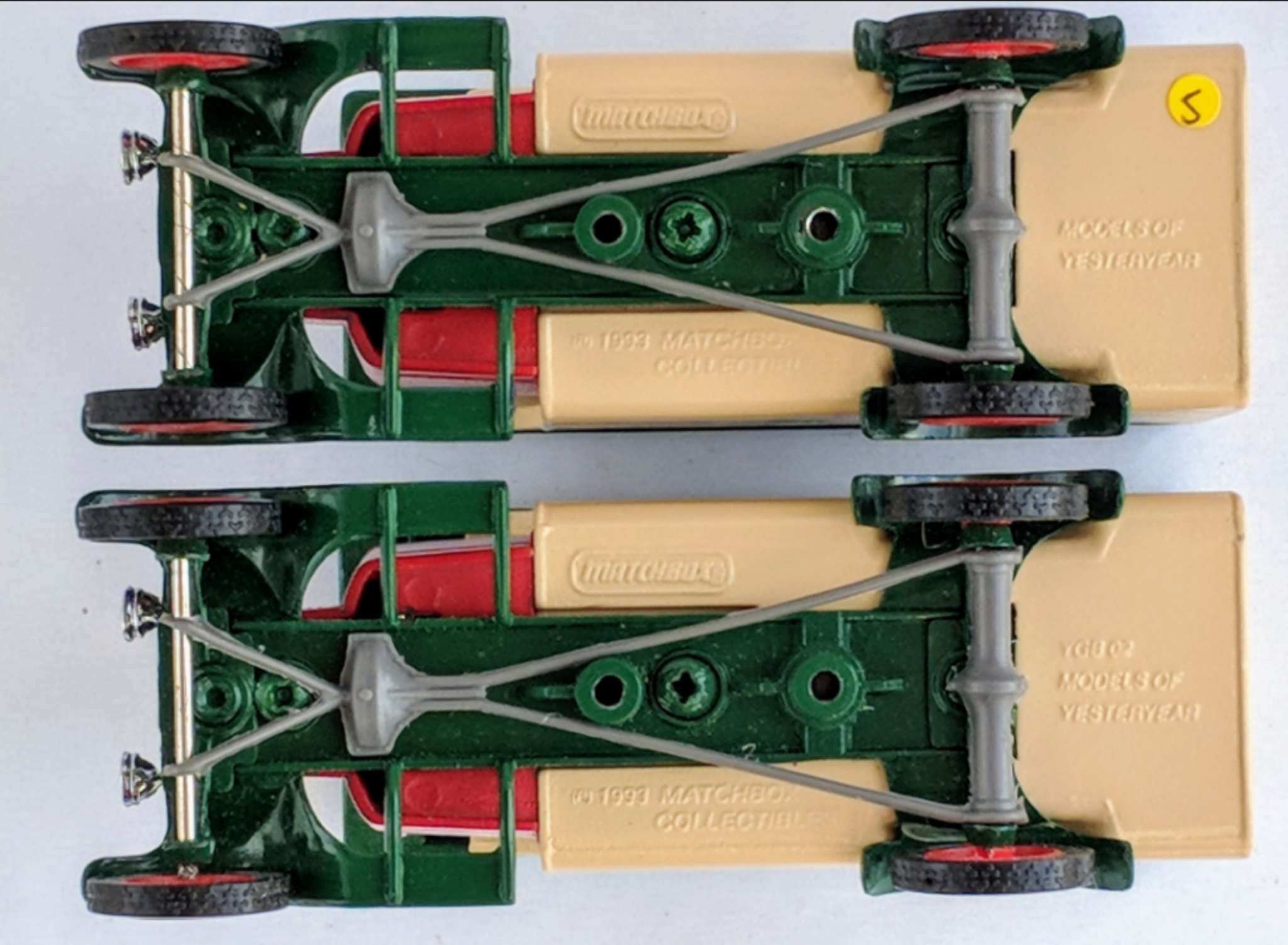 - 1. Bright red bonnet/light tan body/green roof/green base/YGB02/12 spoke gold wheels/gray seat/printed treads on cab steps/cast sidelights.