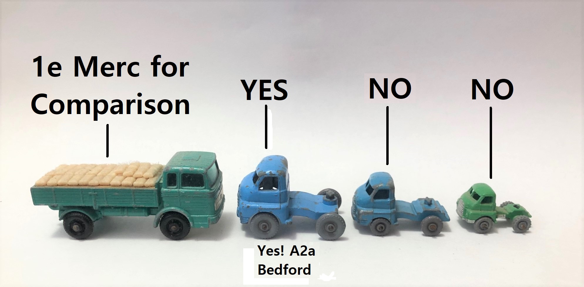 Four cabs, two different sizes for the low loader (27a & 27b green & dark green, blue cab is super rare) The M2a Walls Ice Cream truck (also blue) and then the Car transporter cab which is the largest of them all. Shown here next to the 1e Mercedes lorry (if you don't have the 1e you aren't even trying to collect Matchbox ... at least twice a week, one or two try to sneak into my house, there's literally that many of them out there).misterpop wrote:Joe just a thought......Put the measurement on that as you know there is at least 3 cabs that all look the same even the same colour...Funnily I have sold two last week and listed another last night.Full transporter though sorry no good to you......