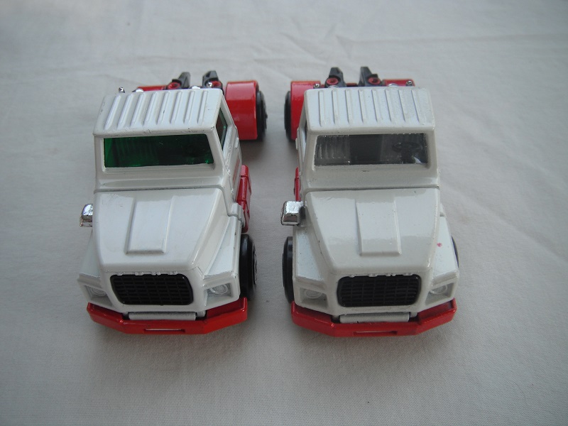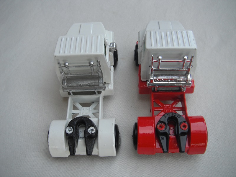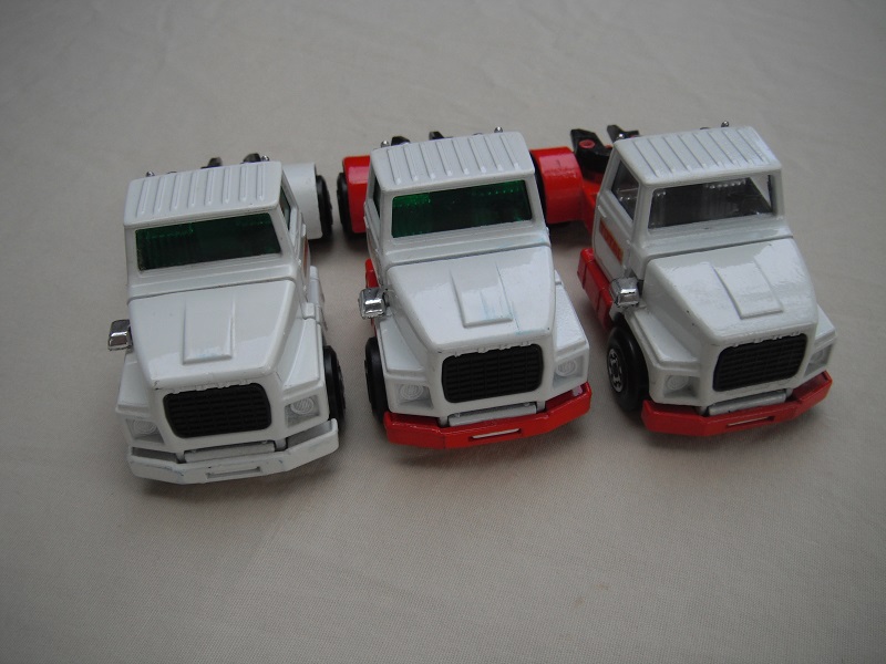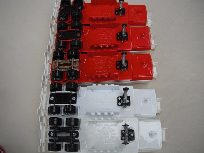 6. Wht cab & red base/grn wind/blk fifth whl(5)/blk xle cvr f.fwd/Total to rear/wht & red trailer/wht hose/gld open xle cvr/lrg rear label.