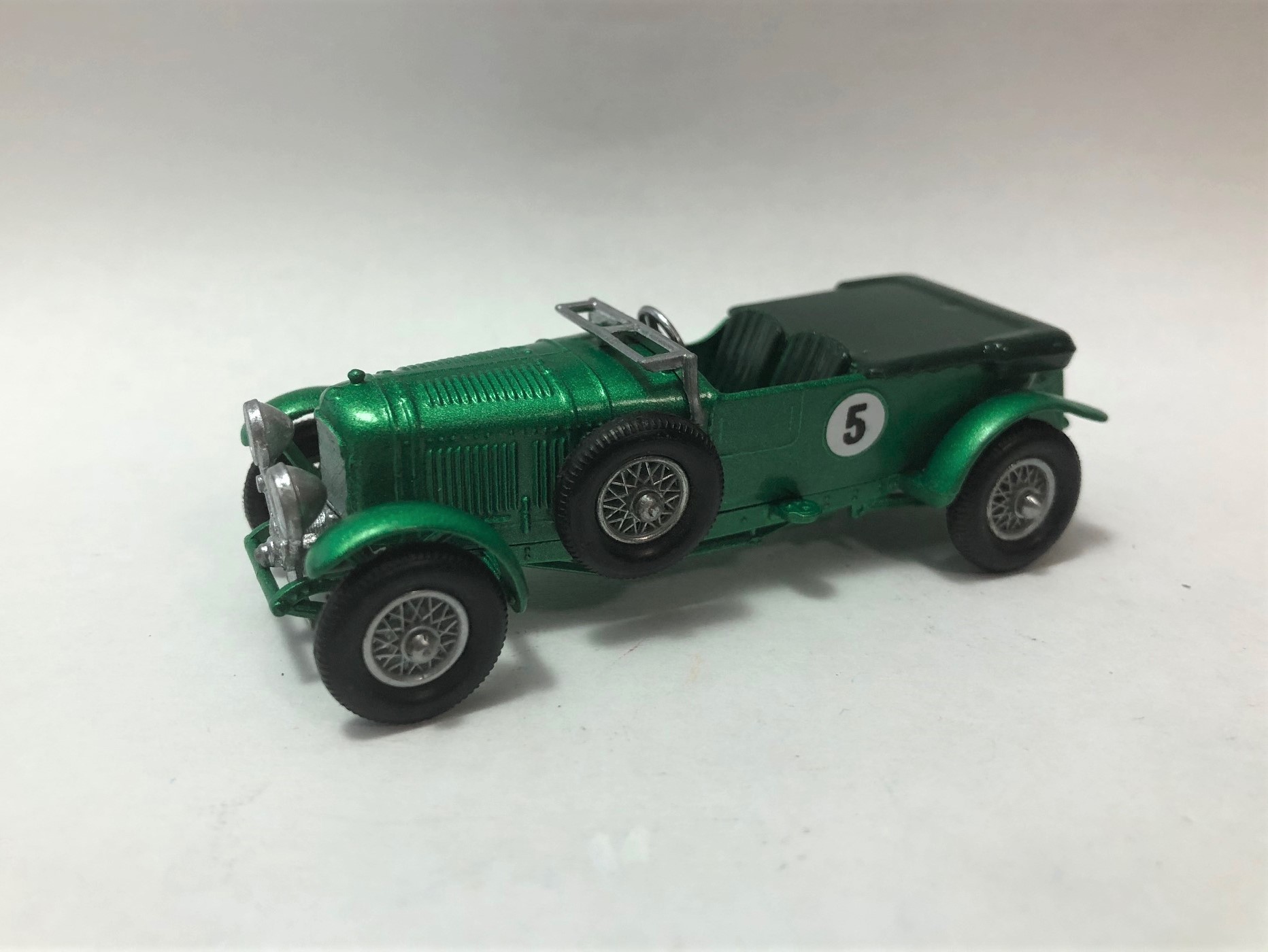 This Y5 Bentley was more work than it looked. All the white metal parts were bent and there was some white knuckle moments heating and straightening them. The steering wheel, the headlights and the windscreen all needed to be carefully straightened. One front fender had to be heated and straightened too. The original headlight assembly was too far gone (bent up and missing one bucket), so I had to use another bent up set off a newer model. That required some modifications to make it work on the first issue casting. All I'm waiting on now is for the Union Jack decals to arrive. Since I was lucky enough to find a half way decent first issue casting, I painted it in the first issue color of Metallic Green.
