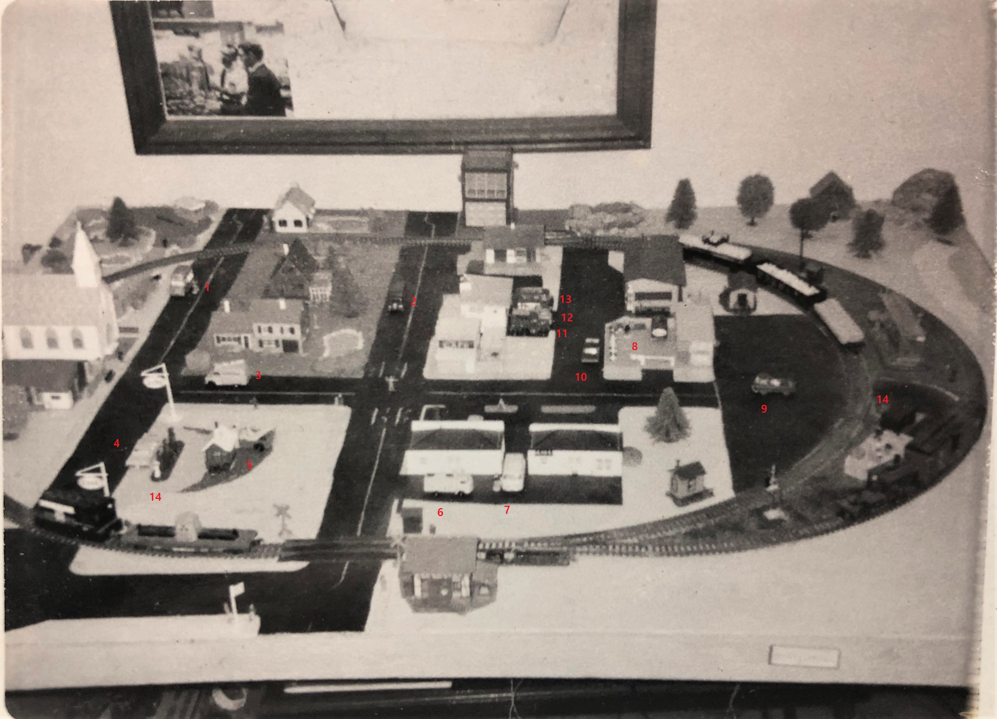 This is a photo of my very first HO train layout complete with Matchbox models. This would be dismantled around 1965 or so and the next layout would take up well over half of a two car garage.*A couple of the models I can not make out, number 2 and number 12. Maybe some eagle eyed viewer can make those two out.